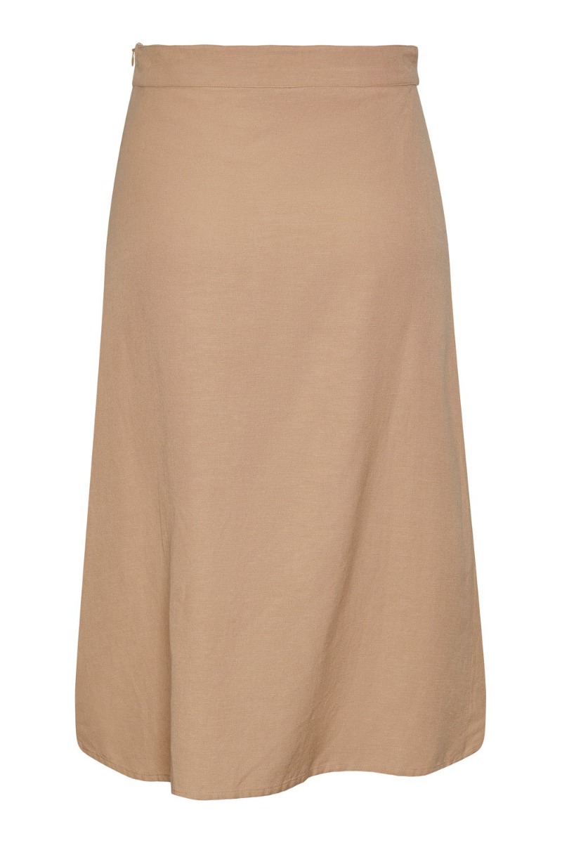 En nem og enkelt nederdel i hør kvalitet fra Pieces. Nederdelen er i en brun farve som går godt til alt. Der er en lille drapering detalje foran i den ene side, som ender i en slids. I taljen er der elastik bagpå og en glat overflade foran. Nederdelen fåes i flere farver.