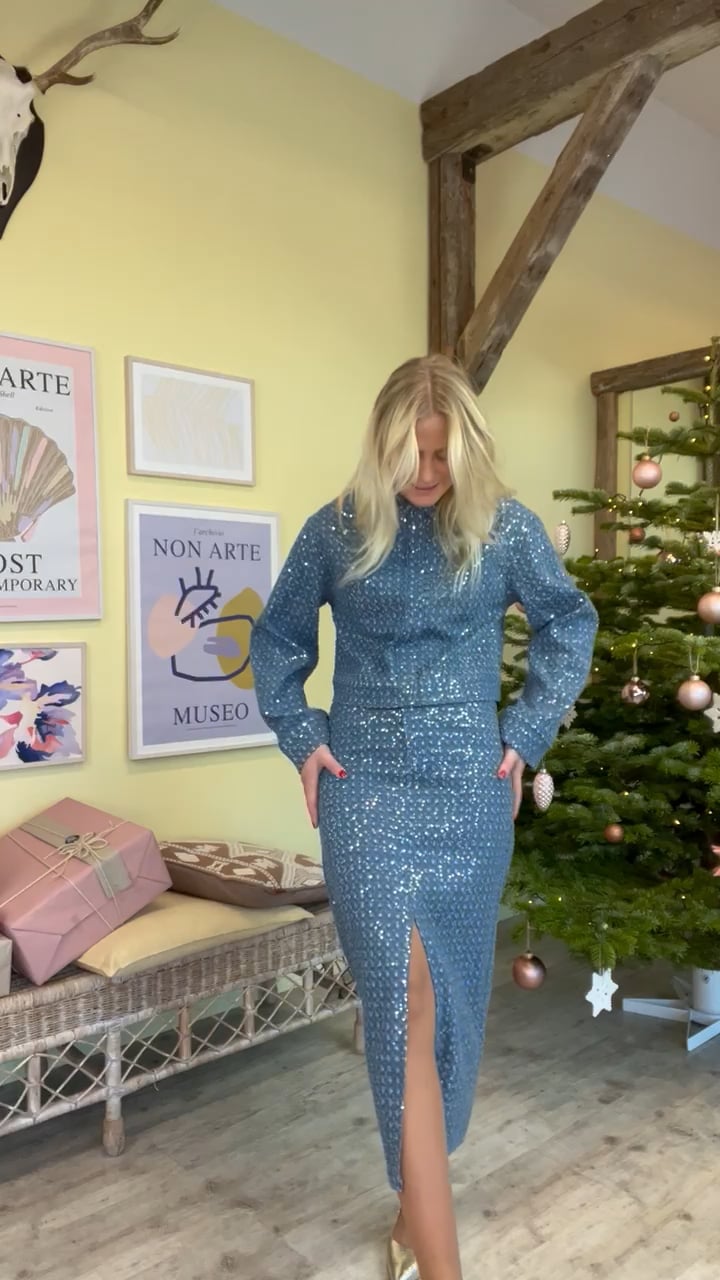 Den fineste nederdel er fra Pieces kommet med masser af glimmereffekt. Den har pailletter over det hele samt hul detaljer med glimmereffekt inde bagved. Den lukkes i taljen med lynlås og knap, derudover er der bæltestropper hele vejen rundt. Den er lang og tætsiddende og med en slids foran.
