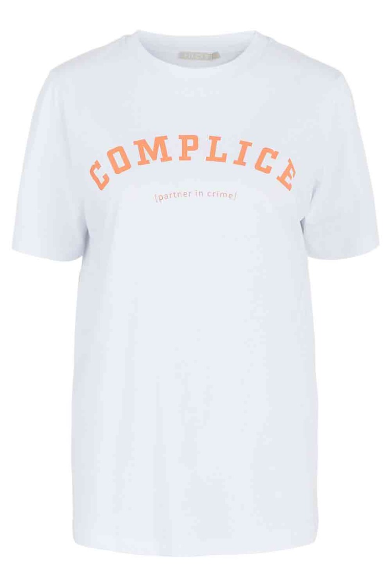 Enkel hvid t-shirt fra Pieces med rund halsudskæring og korte ærmer. Foran er t-shirten designet med et orange "complice" tryk, der giver en cool detalje. Style den med en feminin nederdel eller jeans til hverdag.