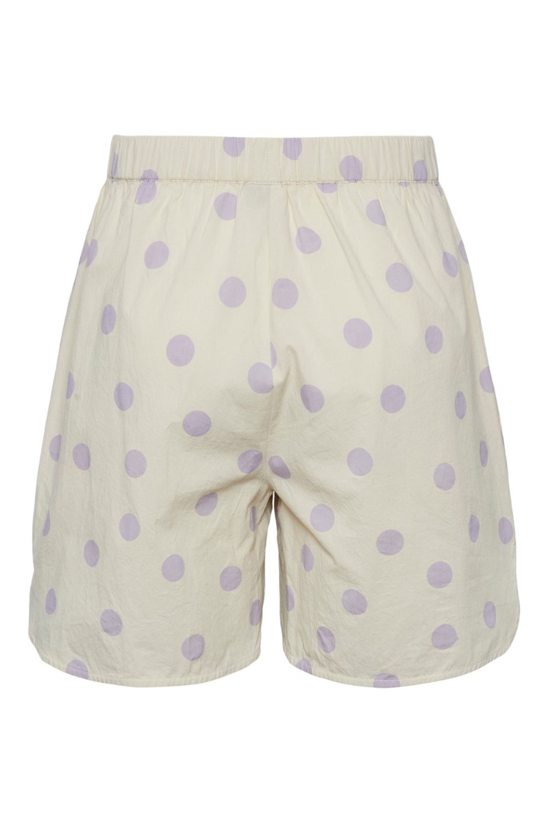 Skønne shorts fra Pieces med en lys baggrund og prikket lilla mønster. Shortsene har et løst snit med en bred elastikkant i taljen og sidelommer. De er super behagelige at have på og kan styles med den matchende skjorte.