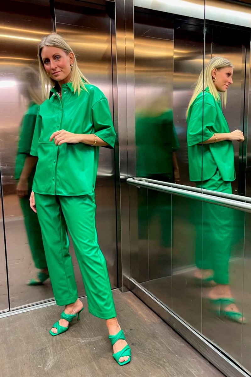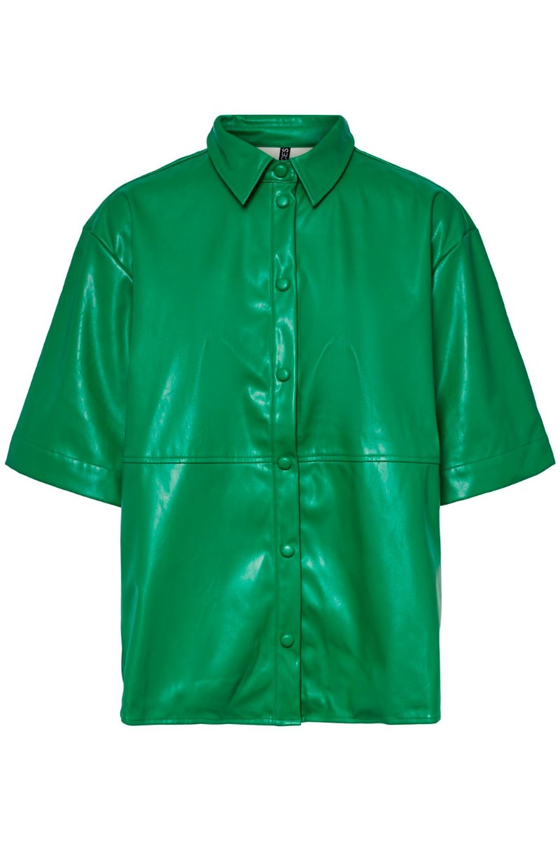 Hop i en af tidens største trends med denne skjorte t-shirt fra Pieces i det kæmpe populære fabric materiale!! Hold nu op hvor er det sejt! Skjorten har korte ærmer og matchende grønne knapper hele vejen ned foran. Der er synlige syninger som giver et råt og cool look til skjorten. Mulighederne er mange når det gælder at skabe et outfit med denne skjorte, men du kan med fordel style med de matchende bukser i samme farve og materiale.