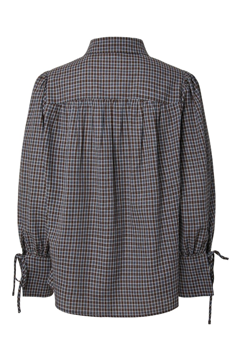 Det er en langærmet skjorte/bluse i et klassisk ternet mønster i brune og blå nuancer. Den har en skjortekrave og skjult knaplukning foran, som giver et rent og elegant udtryk. Ærmerne er let puffede ved skuldrene og afsluttes med manchetter, der kan justeres med fine bindebånd i siden, hvilket tilfører et feminint og lidt legende touch. Pasformen er let løs og behagelig, så den falder flot på kroppen. Det tidløse ternede design gør blusen nem at style både til hverdag og mere formelle outfits.