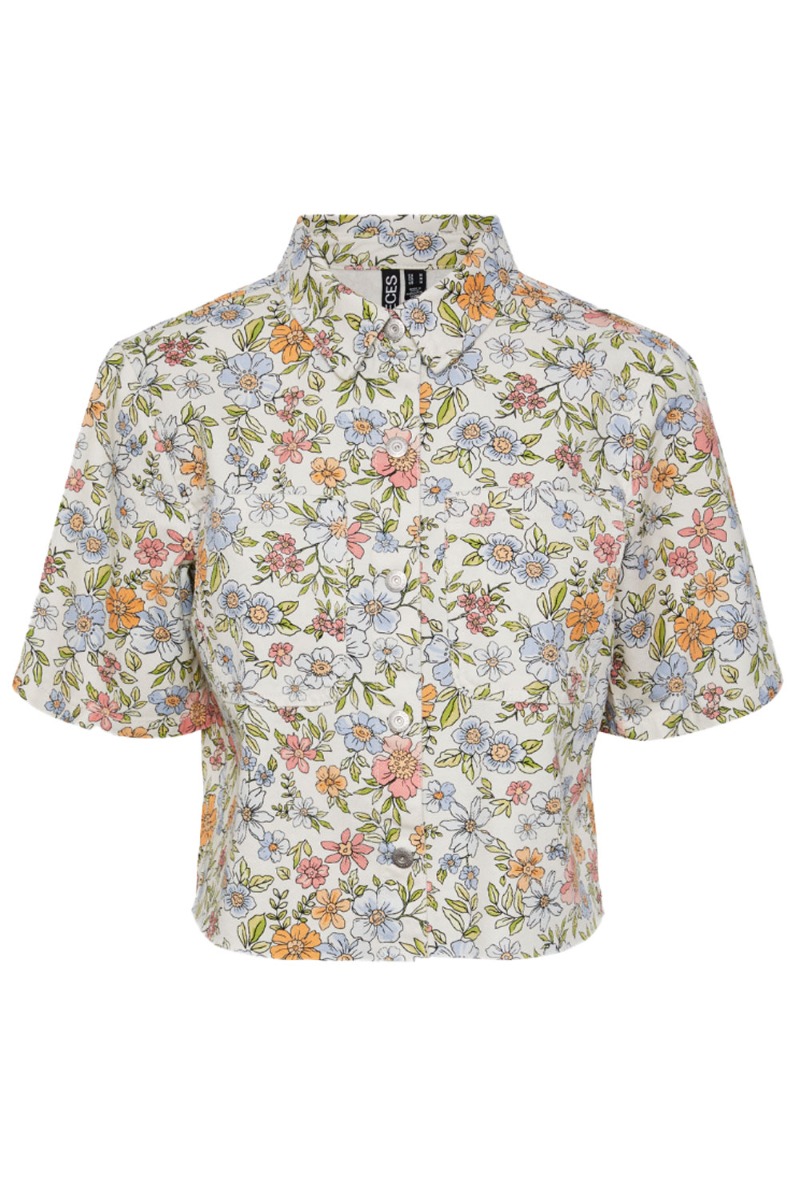En fin skjorte t-shirt fra Pieces er kommet i et smukt nyt blomsterprint. Den er i en let denim kvalitet og lukket med trykknapper foran. Den har klassiskmskjortekrave og med korte ærmer. Der findes et par matchende bukser til.