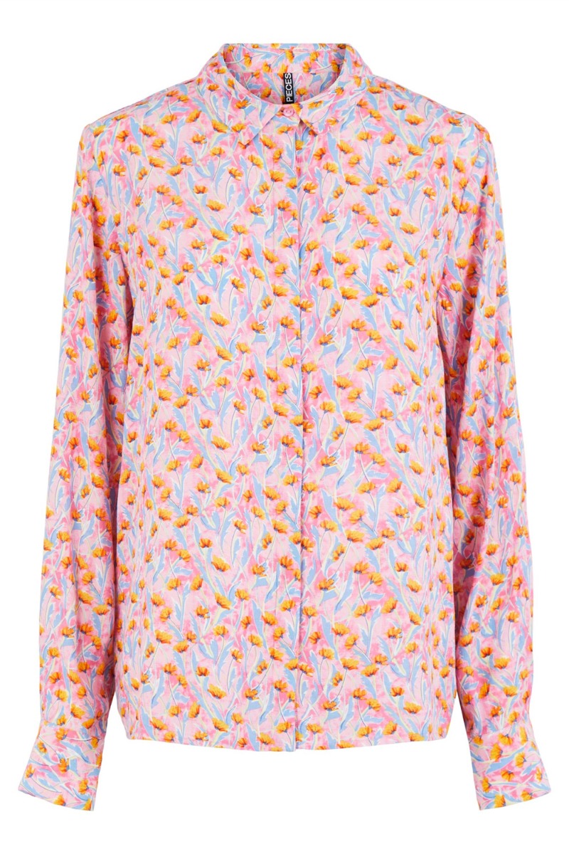 En rigtig sød skjorte der stråler af SOMMER! Skjorten er designet i en let luftig kvalitet med knapper foran og lange ærmer. Bundfarven er lyserød med et grafisk blomsterprint i blå, orange og gule nuancer. Style den med de matchende bukser eller en denim nederdel.