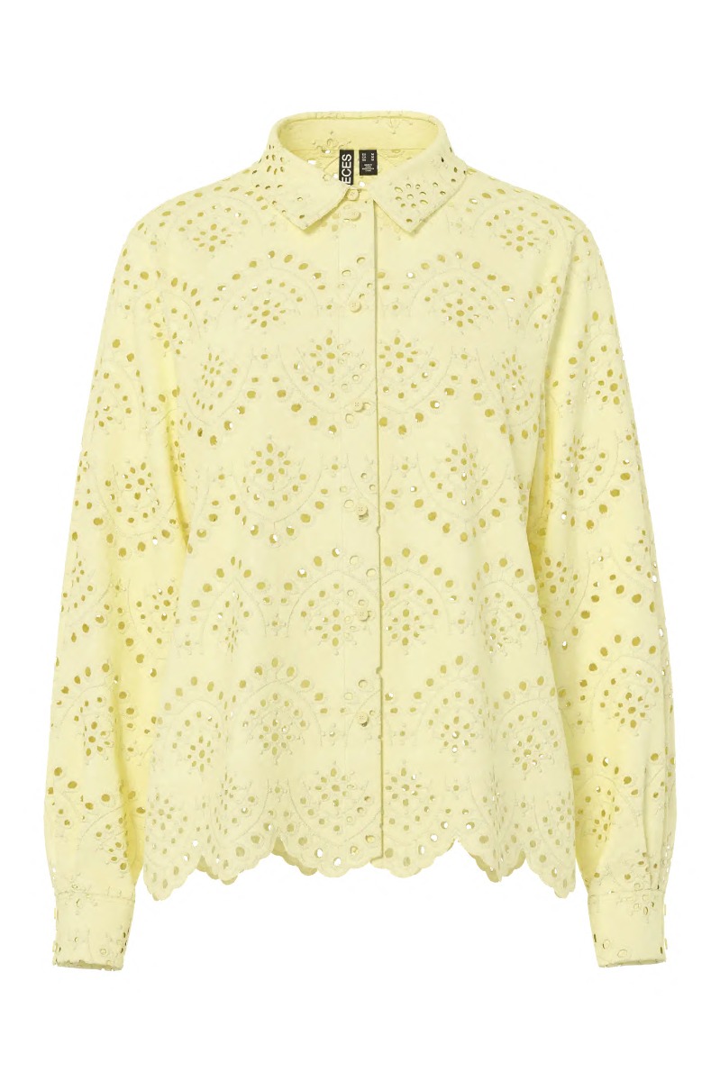 En smuk skjorte fra Pieces i en skøn gul farve. Den er med fint m ønster i stoffet og derfor også gennemsigtig så vi anbefaler at du bruger en top under. Den er ammevenlig og har en løs pasform. Perfekt her til sommer både åben og lukket.