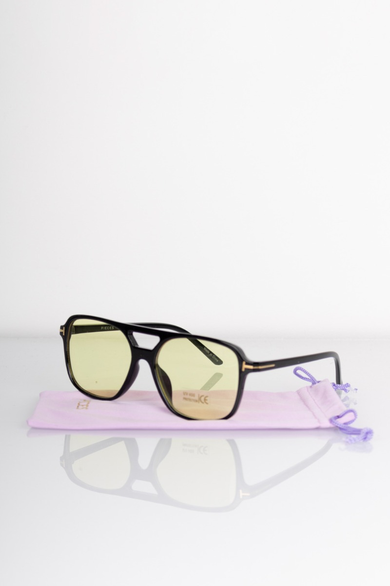 Seje solbriller fra Pieces med sort stel og gennemsigtig gult glas. Totalt cool og en rigtig 70'er brille, og er bare en sej accessories til foråret. De findes i flere farver