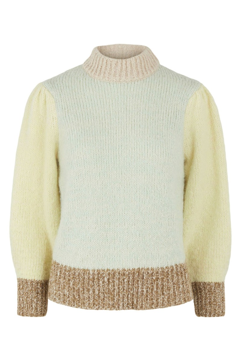 Dejlig strik fra Pieces i de sejeste nuancer. Strikken er grøn med gule ærmer i et løst snit med et lille pufærme. Den er super cool at style med et par denim jeans til hverdag.