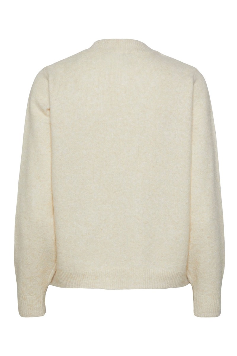 En flot strik fra Pieces er kommer i en hvid farve. Den er tæt i strikken så den ikke er gennemsigtig, dog anbefaler vi altid at du bruger en top under. Kvaliteten er dejlig blød og behagelig at have på hele dagen. Den er løs i pasformen med en let ribkant ved ærmer, bund og hals. Derudover findes den også i mørkebrun og i en lysbrun farve.