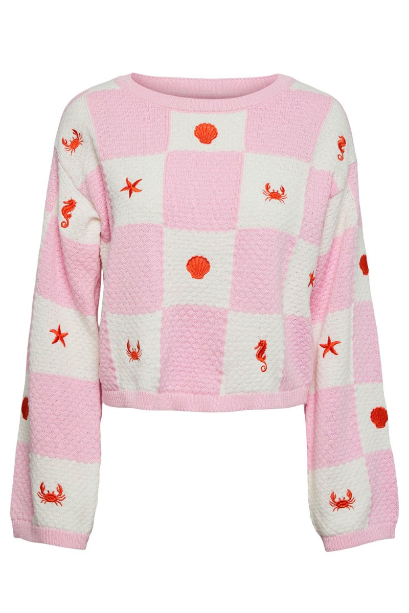 En virkelig fin strik fra Pieces med tern i hvid og rosa. I de hvide tern er der broderet et havdyr i orange tråd. Ærmerne er brede i bunden men afsluttes dog stadig med ribkant. Trøjen er lidt lille i strørrelsen, så ligger du mellem to størrelser skal du vælge den største.