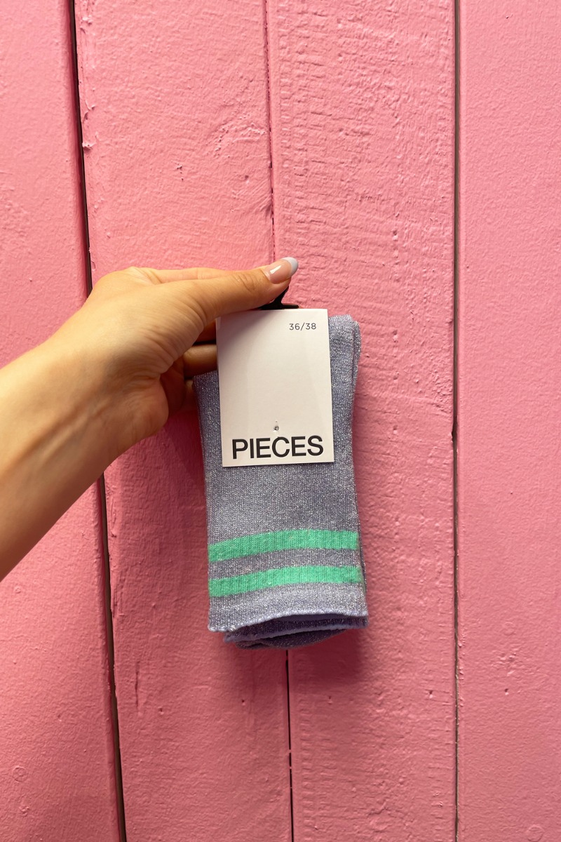 Lilla glitter strømper med grønne striber fra Pieces. Strømperne er bløde i kvaliteten og helt perfekt at style til dit hverdagsoutfit. Findes i flere farver samt både med og uden glimmer.