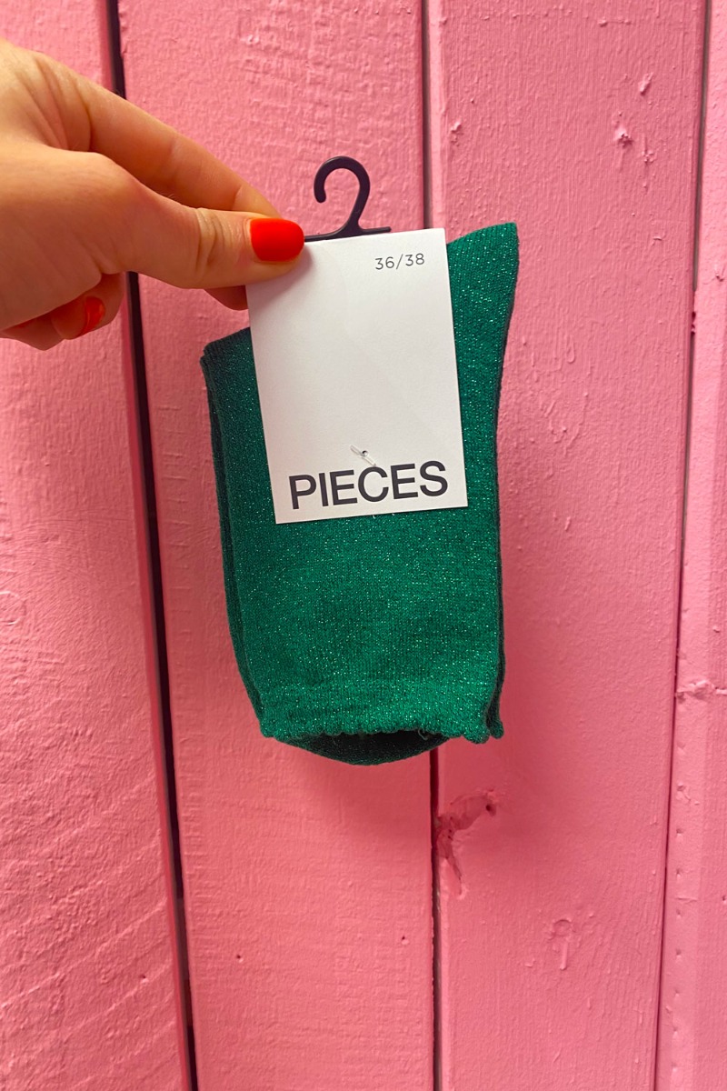 Mørkegrønne strømper med grøn glimmereffekt fra Pieces. Strømperne er et MUST til dine looks året rundt og findes i flere skønne farver.