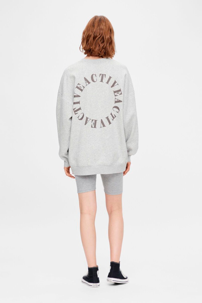 Cool oversize grå sweatshirt fra Pieces. På ryggen er der et rundt try med teksten "Active". Kan styles nemt over et par tætsiddende shorts som på billedet.