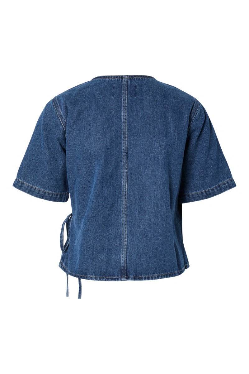 Sød t-shirt fra Pieces. Denne t-shirt har et elegant design, med slå-op effekt og i denim kvalitet. Den bindes på siden og har v-udskæring. Den er virkelig fin til et par denim shorts eller style den med matchende nederdel, for et fuldendt look!