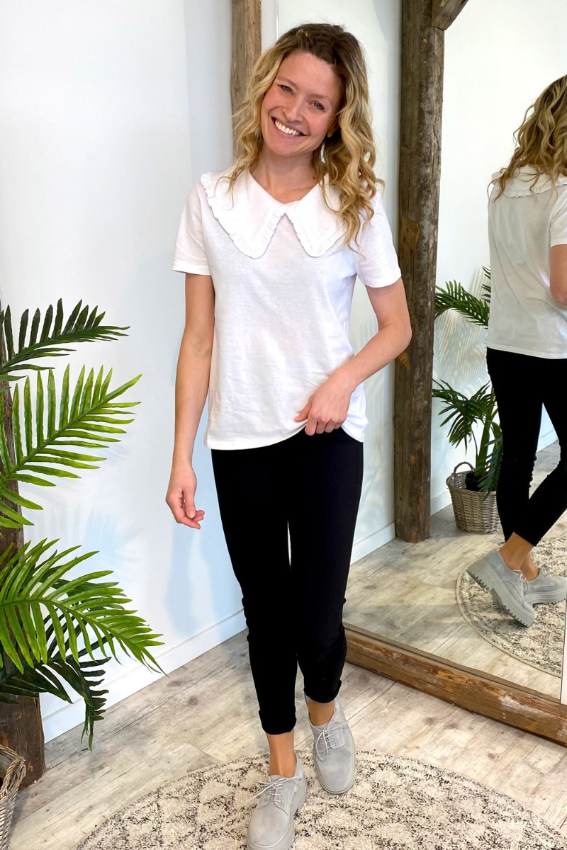 Enkel hvid t-shirt fra Pieces der er designet med den fineste krave og flæsekant, der giver en sød og feminin detalje. Den er lavet i det blødeste materiale i 100% økologisk bomuld. Style den alene eller med en vest over til de kølige dage.