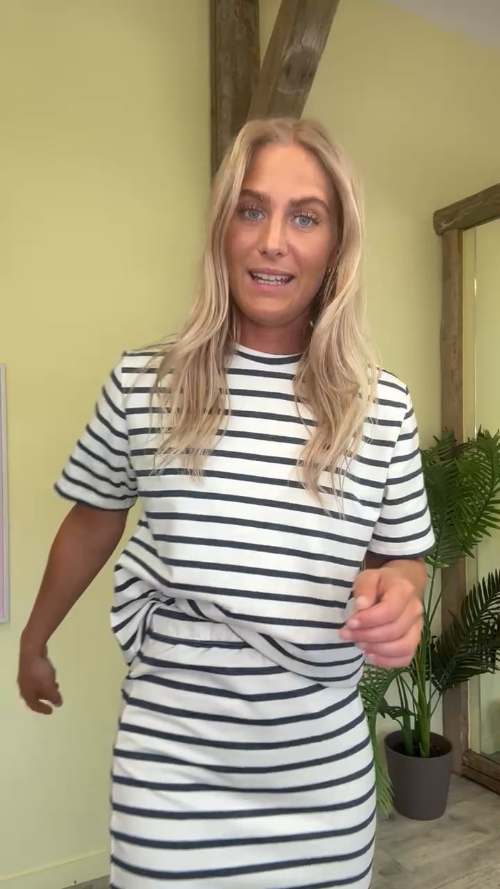 Den lækreste t-shirt fra Pieces i den blødeste kvalitet! Den er hvid med en blå stribe og har en løs pasform. Der findes shorts samt nederdel til, så du kan skabe et helt sæt.