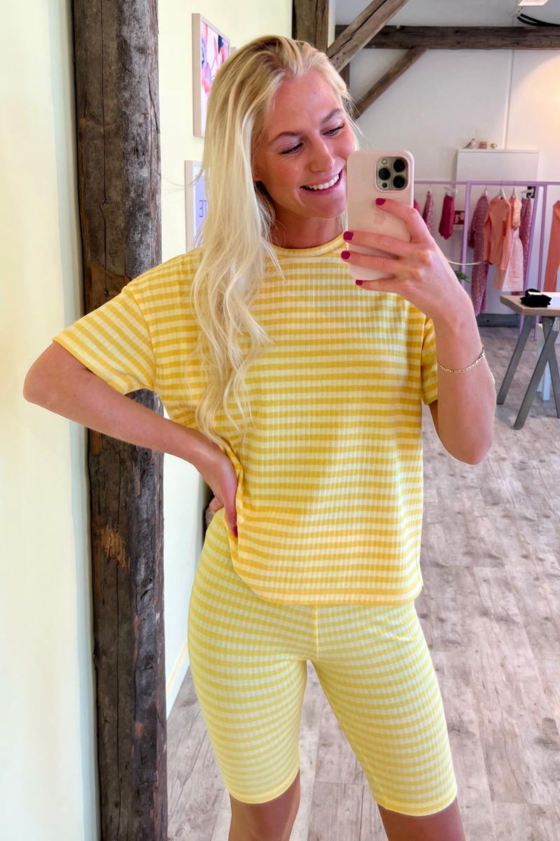 En dejlig blød t-shirt fra Pieces i ribkvalitet med masser af stretch, rund halsudskæring og korte t-shirtærmer. Den har matchende cykelshorts i samme stribet mønster og er super sejt at bruge som sæt.