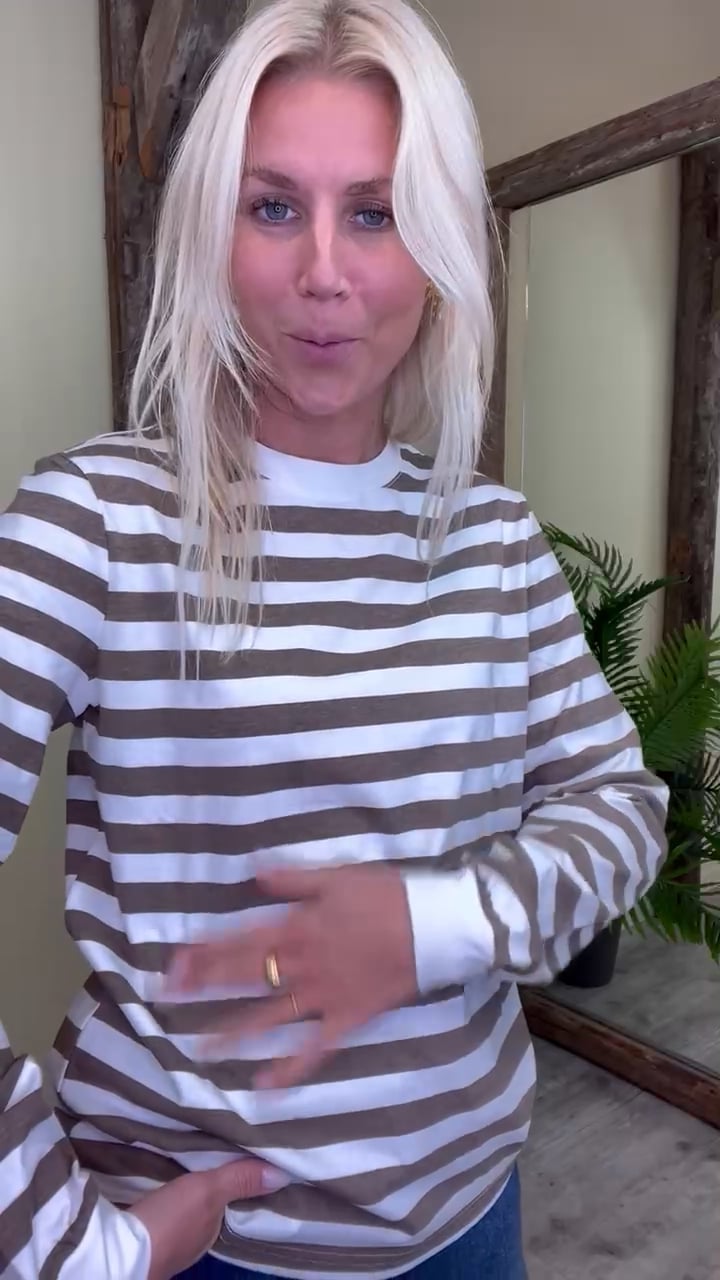 Stribet bluse fra Pieces i hvid og brun. Blusen er let rummelig og har en fast elastik ved ærmerne. Den er med rund hals og er helt normal i størrelsen. Den findes i flere farver og er så skøn at have på! En perfet stribet bluse som alle burde have i garderoben her til sommeren!