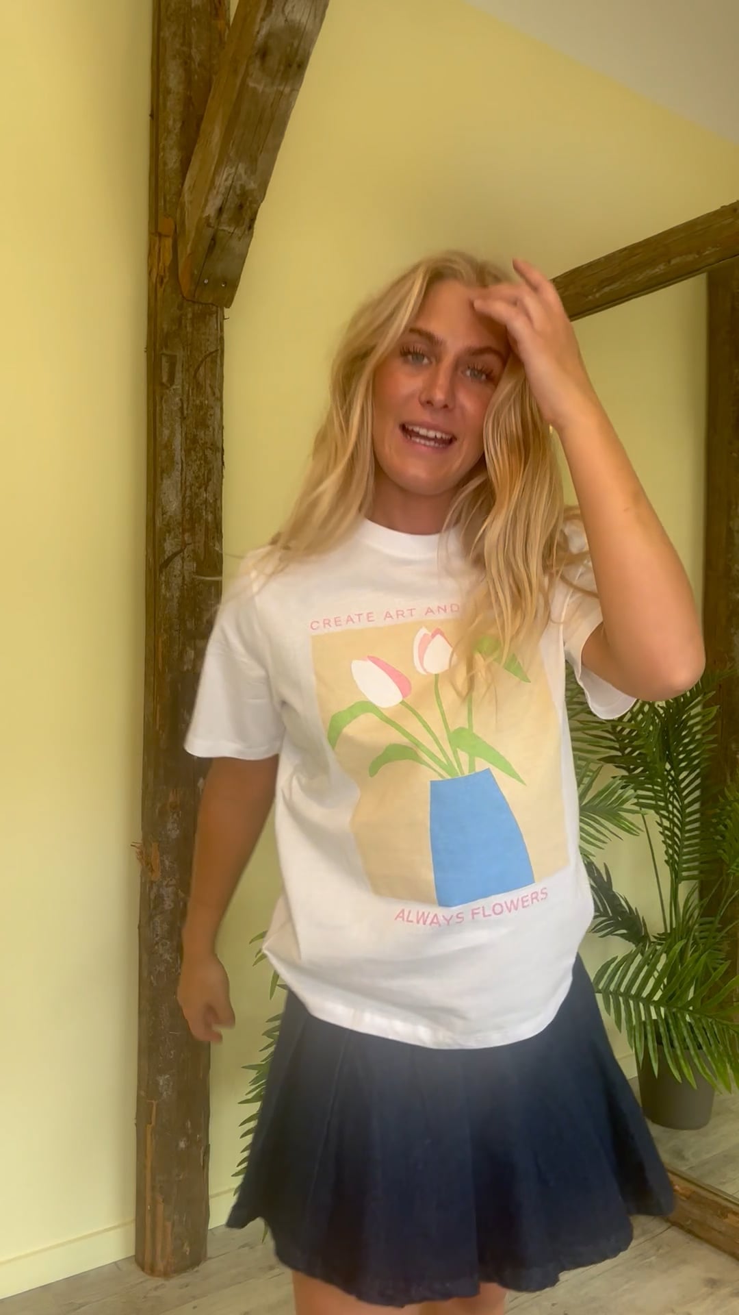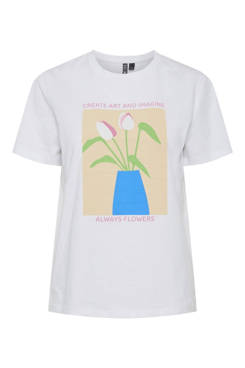 En fin t-shirt fra Pieces i en let kvalitet. T-shirten har et farverigt print foran af en vase med flotte tulipaner. Passer perfekt til et par shorts eller en nederdel. Findes også med et andet print.