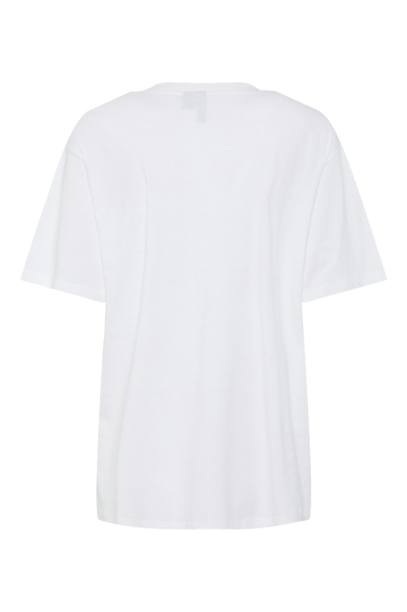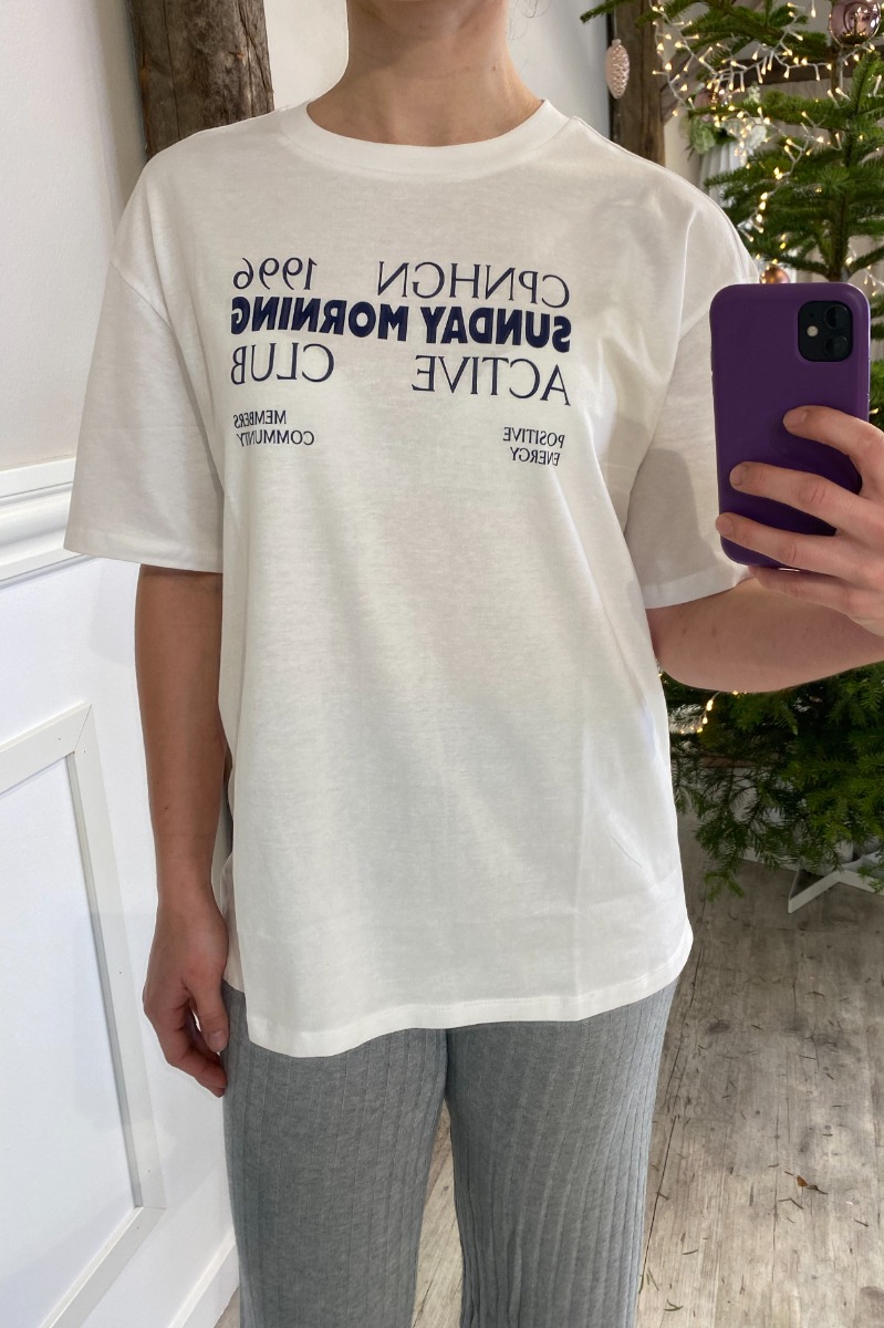 En smart t-shirt med et sporty look fra Pieces. Denne t-shirt har en afslappet pasform og desinget med tryk på brystet. T-shirten har en klassisk hvid baggrundsfarve med tryk i navy.