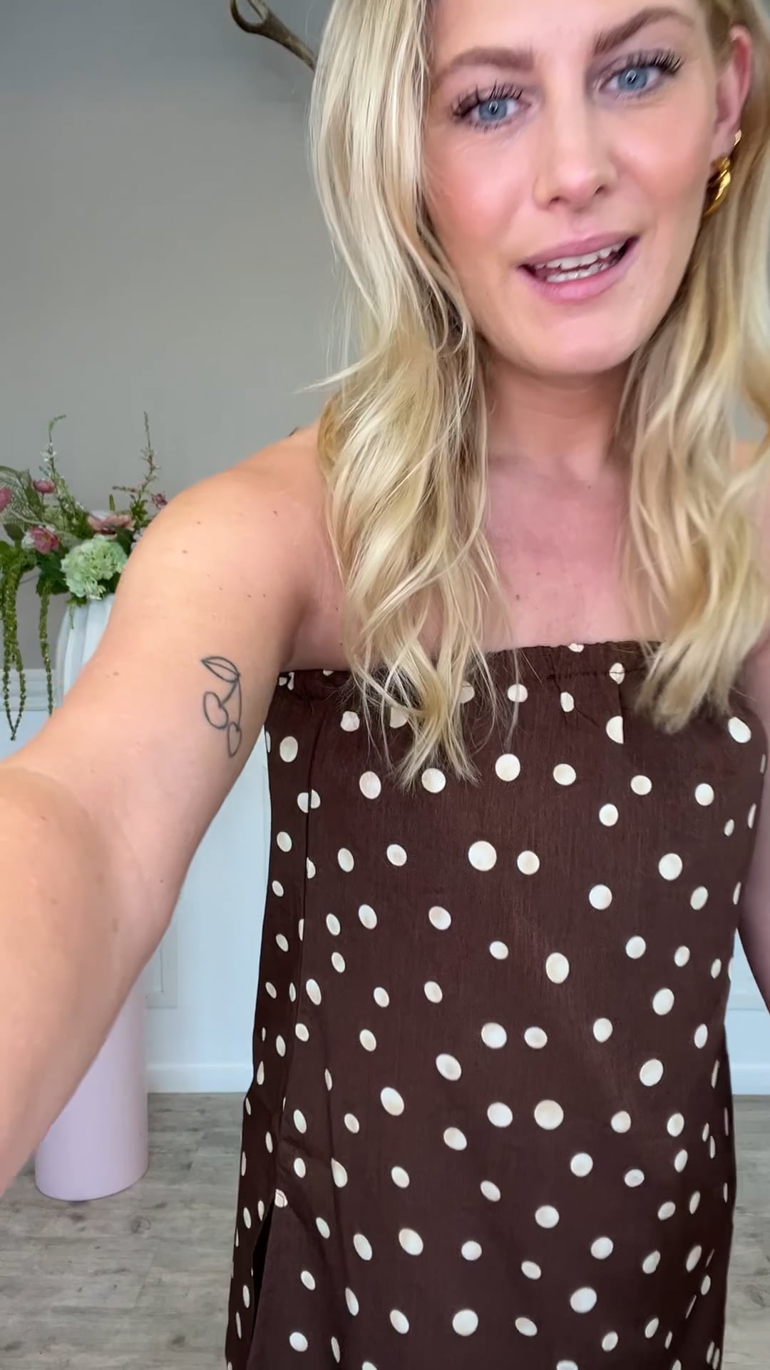 En fin top fra Pieces er kommet i brun med hvide prikker. Den er i en bandeau model som betyder den ikke går op over skulderne. Der findes en matchende underdel så du nemt kan lave et sæt.