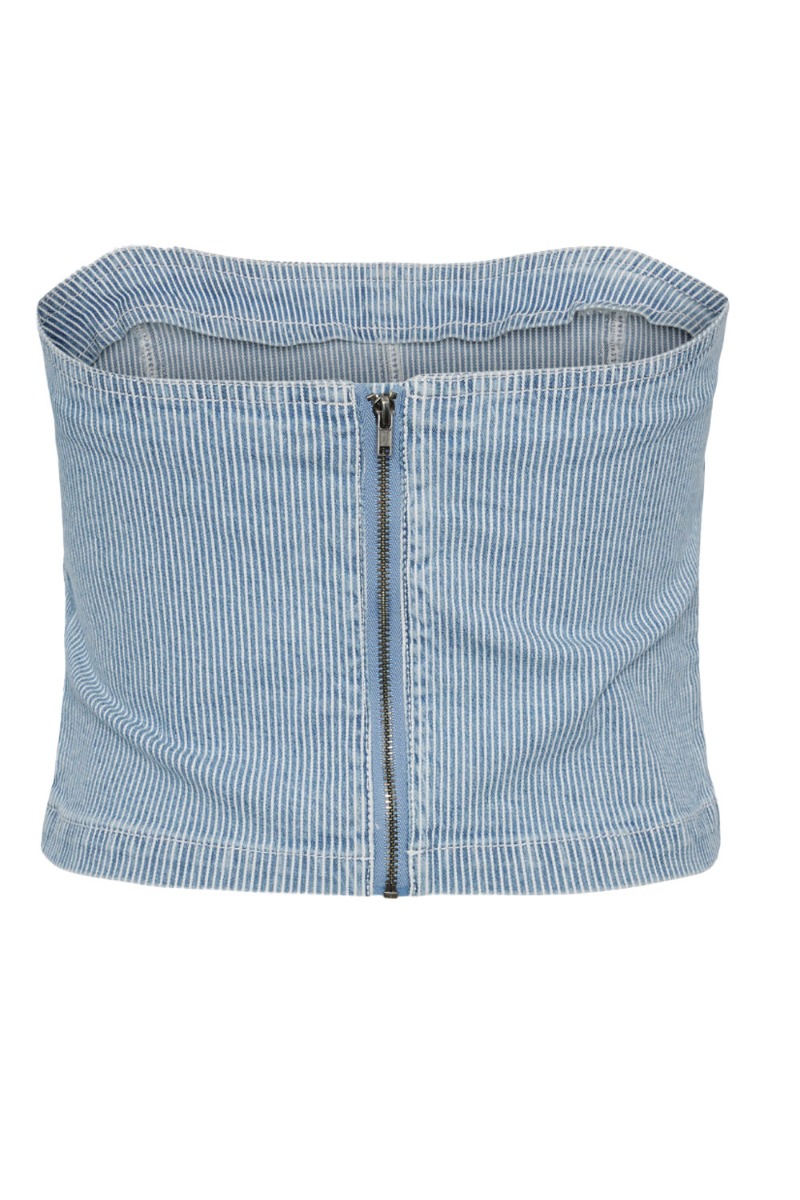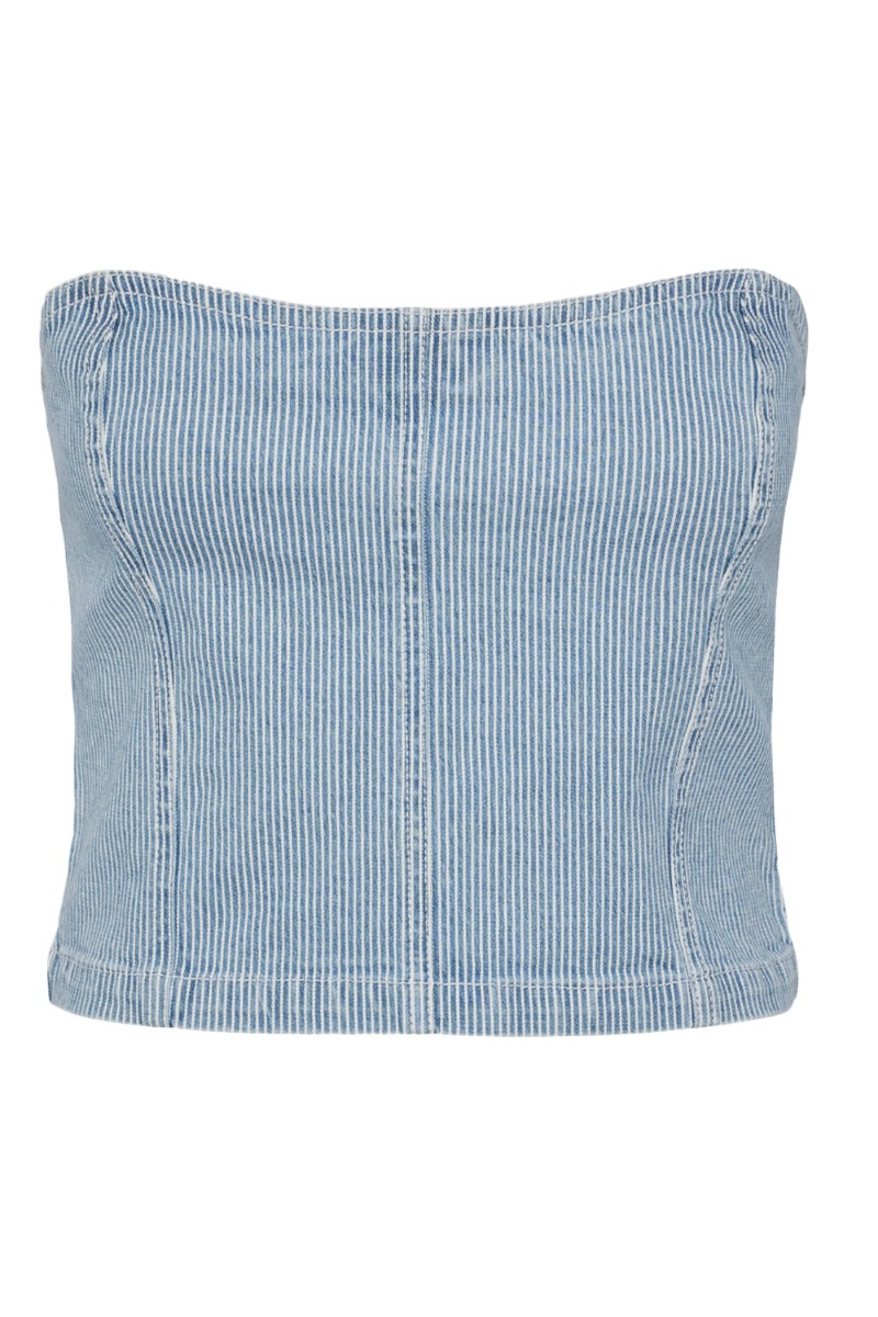 Et fin og simpel top fra Pieces er kommet. Den er uden stropper og lukkes bagpå med en lynlås. Den er tætsiddende og kan nemt bruges til et par jeans eller måske den matchende nederdel. Derudover er den i en lækker denim kvalitet som giver et mere hverdags look.