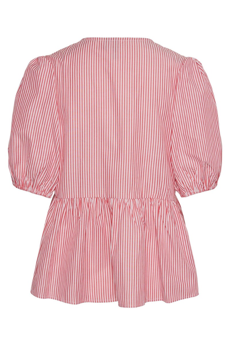 SÅ PIGER!! Her skal i ikke vente for længe!! vi ved sættet blev revet væk sidst i blå nu er det landet i denne fine rødstribet. Blusen har den fineste pasform med peplum i bunden og snøredetalje foran. Den har volumiøse korte ærmer med elastikkant i enden og super fin at style med de matchende bukser.
