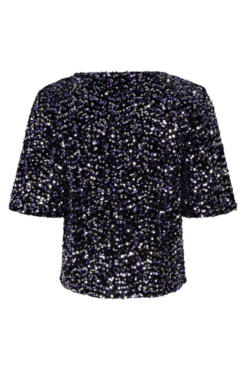 Den flotteste bluse fra Pieces. Blusen er lavet i sort velour med pallietter i lilla nuancer. Blusen har en løs pasform og er med t-shirt ærmer og rund hals. Style blusen til de matchende bukser for et festligt look!