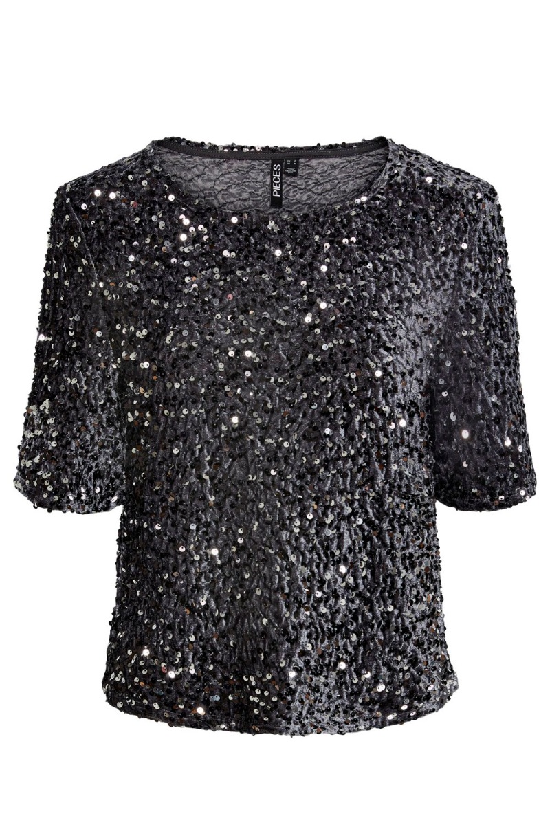 Fineste top fra Pieces i en rummelig pasform. Toppen er i en grå velour kvalitet og med de fineste palietter i sølv, som jo egner sig perfekt til de kommende fester. Style toppen til de matchende bukser, for et fuldent partysæt!