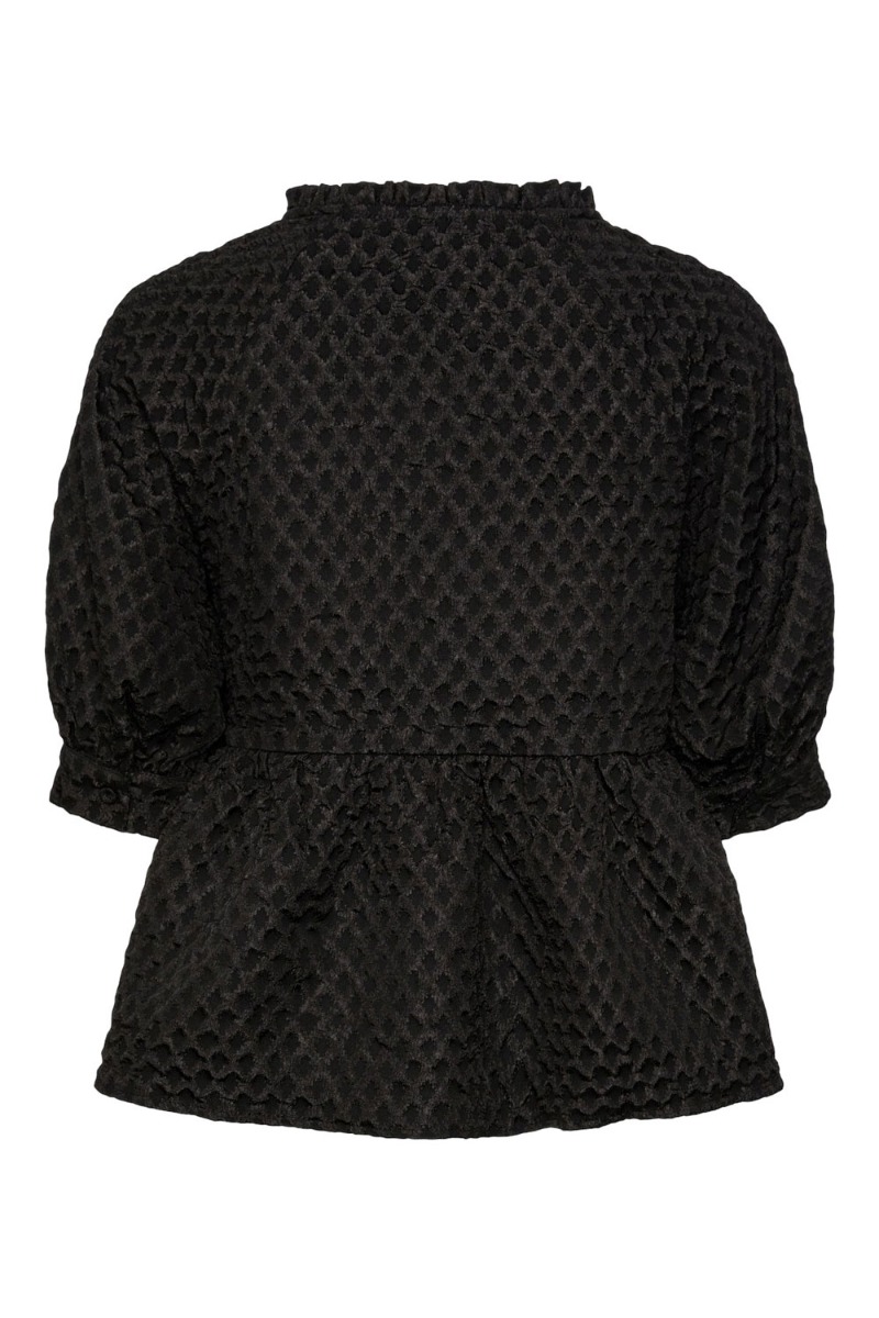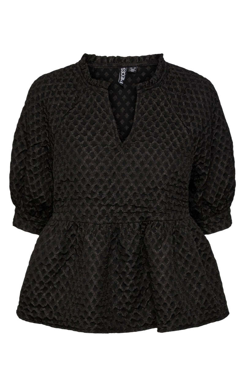 Den sødeste top fra Pieces er kommet i en simple sort farve. der er sturktur i stoffet og dette giver et fint udtryk til stylen. Der findes et par matchende bukser men de kan sagtens bruges hver for sig. Den er med peplum effekt i bunden og har korte pufærmer samt V hals foran. Derudover er der en lille flæsekant ved halsen.