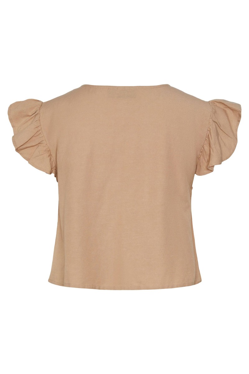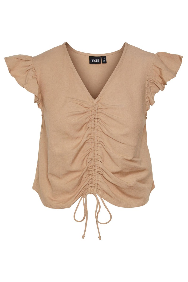 Sød sommertop fra Pieces i en flot brunlig farve med matchende nederdel. Toppen er cropped med rynkedetalje foran der kan snøres op og et lille flæseærme. Den er i en let hørkvalitet der gør den anvendelig til de varme sommerdage.