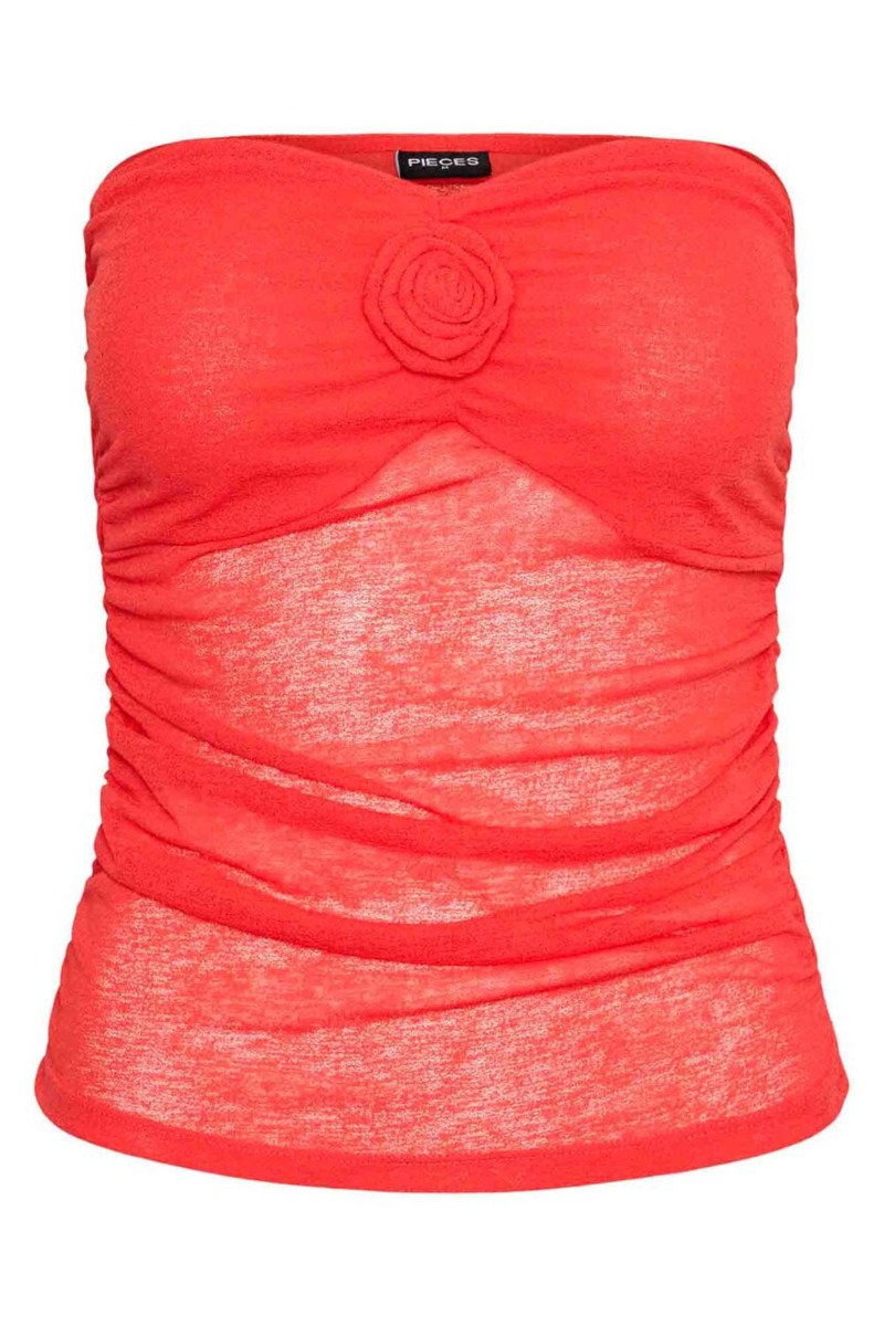 En fin top fra Pieces er kommet i en smuk rød farve. Toppen er helt gennemsigtig og derfor anbefaler vi at du bruger en anden tube top under eller måske bruger den over en skjorte. Den har gummikant over brystet og har en fin rose detalje i midten ved brystet. Derudover er der rynkeeffekt i begge sider og den findes også i sort.