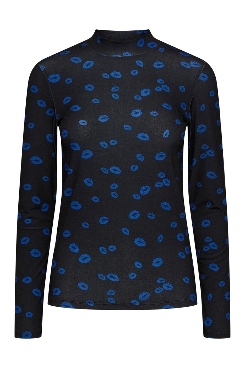 Super lækker sort langærmet bluse, som er dekoreret med de fineste blå kys munde. Blusen er i en glat kvalitet med masser af stræk og en lille turtleneck. Blusen er perfekt at style under en spencer, som også vises her på vores look. Blusen har et sporty look og kan også styles til de matchende tights med kys-munde.