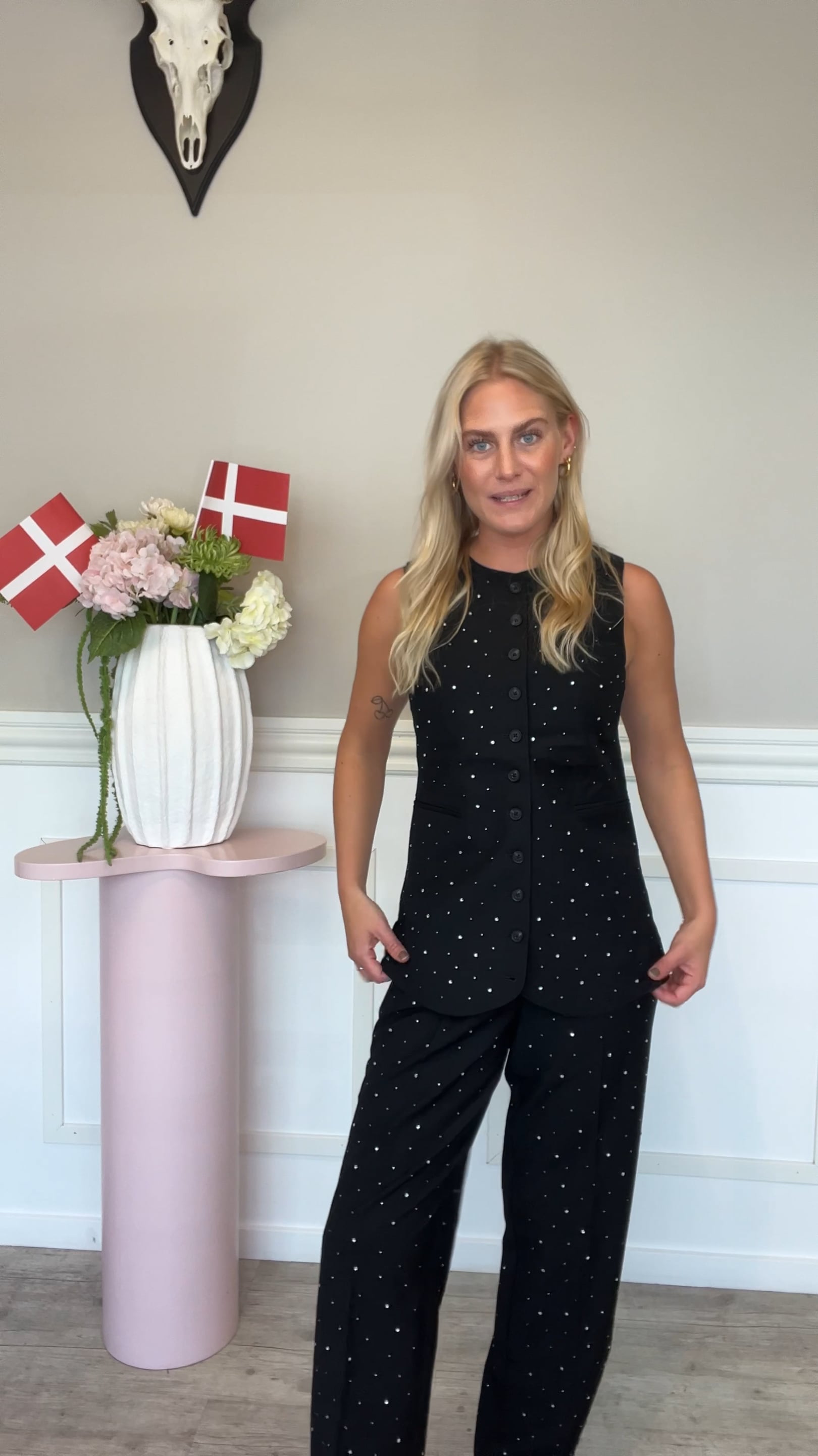 En super fin vest fra Pieces i klassisk sort med knapper. Denne vest er prydet med fotte rhinsten, som bare gør den super festlig og derfor også særligt velegnet til den kommende sæson, som vi nu går i møde!