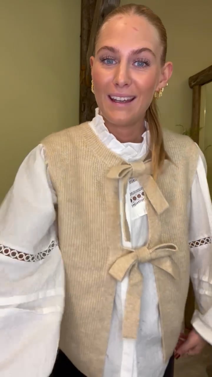 En sød vest fra Pieces er kommet i en lækker blød strik kvalitet. Den er med fine sløjfe detaljer foran og er faktisk vendbar så du nemt kan have sløjferne bagpå også. Den er sej med en t-shirt under til hverdag og med enten et par jeans eller en nederdel.