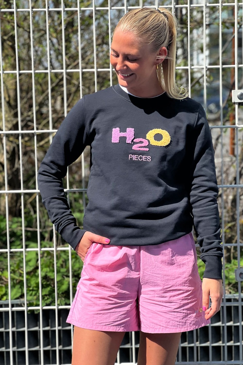 Sejeste collab mellem Pieces og H2O som byder på lækre styles i cool nuancer! Sejeste oversized sweat i navyblå med gult, lilla og pink H2O logo og lyslilla Pieces logo. Sweaten har en løstsiddende og oversized pasform med rund halsudskæring og ribkant langs bund, ærmer og halsudskæring. Styl den til sommeren med de matchende shorts eller et par rå denim jeans.