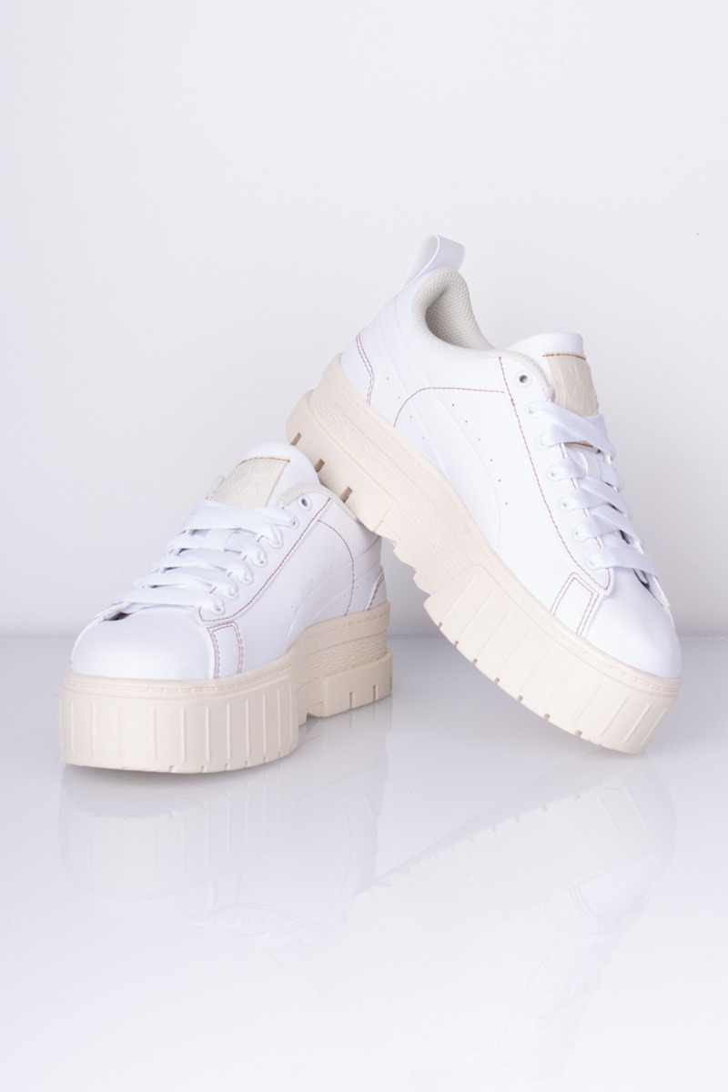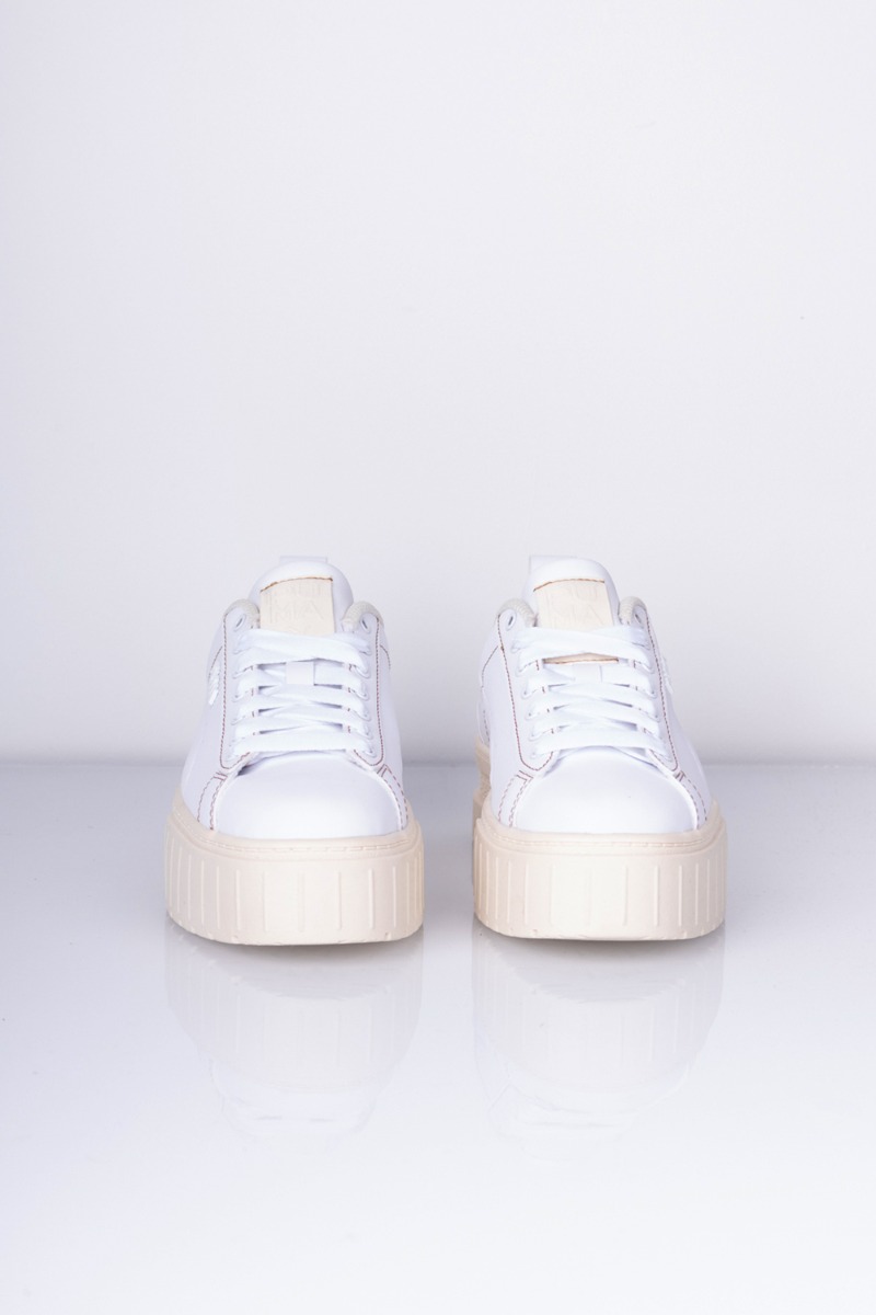 Tjek lige den fineste sneakers fra Puma i hvid læder med råhvide detaljer på blandt andet den chunky sål og i inderforet. Der er logo foran hvor der står "PUMA", der giver et fedt spil til den ellers hvide sko.
