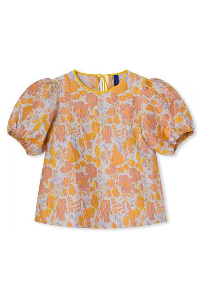 Muligvis en af de smukkeste bluser vi længe har set! Résumé blusen er med korte ballonærmer der afsluttes med elastik. Den har et oversize look og bindes i nakken med en gul snøre der giver en smuk åbning bagtil. Style den til fest med bukser.