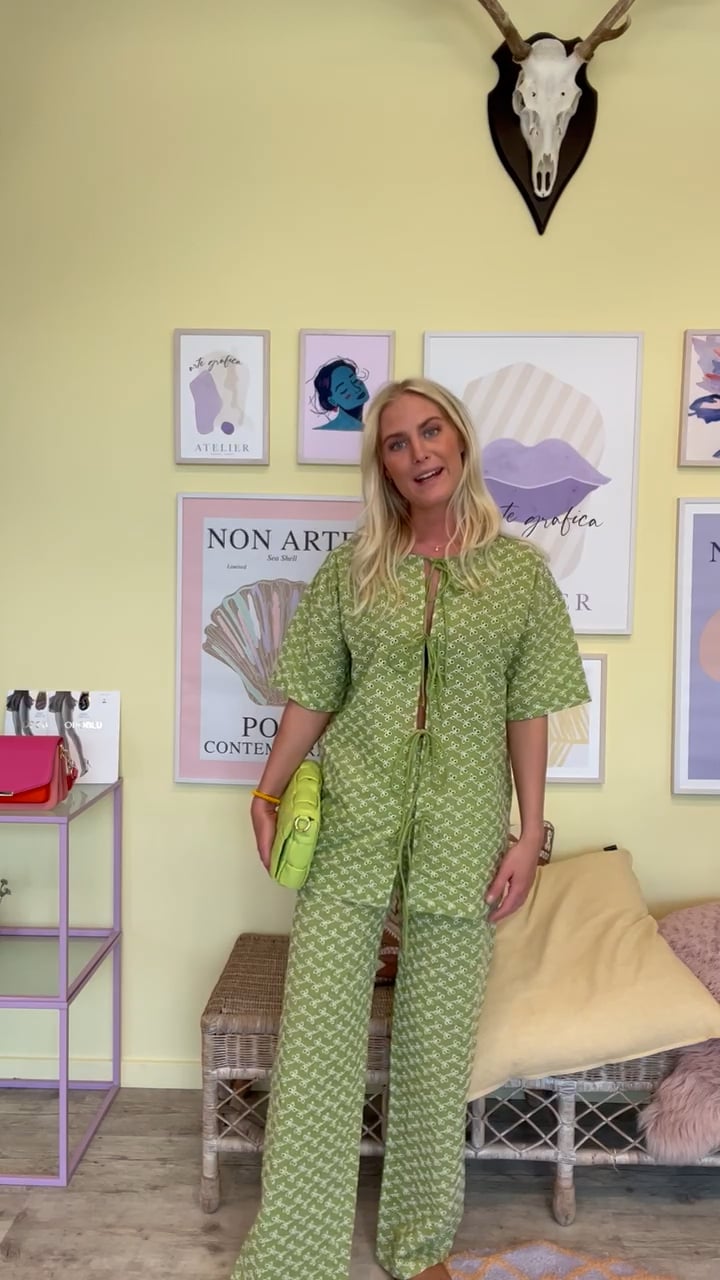 Endelig er de sødeste broderet bukser landet fra Résumé. Bukserne er lavet i en løs pasform der er lige i benene med elastik i taljen. Bundfarven er grøn som vi kommer til at se meget til denne sæson med et hvidt broderi mønster. De er så fine at style med den matchende skjorte for et fuldendt sæt.