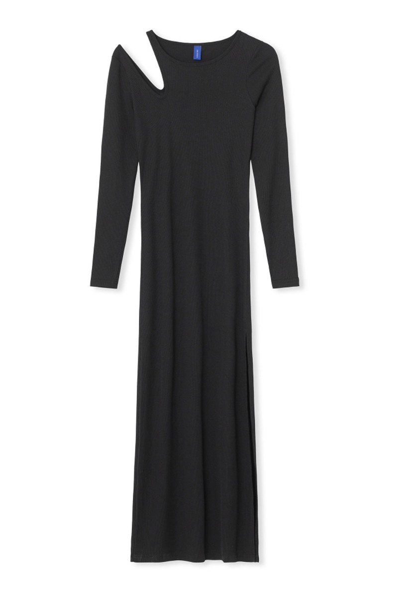 Sort kjole med udskæring ved højre skulder fra Résumé. Kjolen er lang i en tætsiddende pasform med stretch der gør den anvendelig med en babybule også. Kjolen falder utrolig flot og viser vores kvindelig former frem. Den har et enkelt udtryk men med små seje detaljer der gør den oplagt til festlig anledning også.
