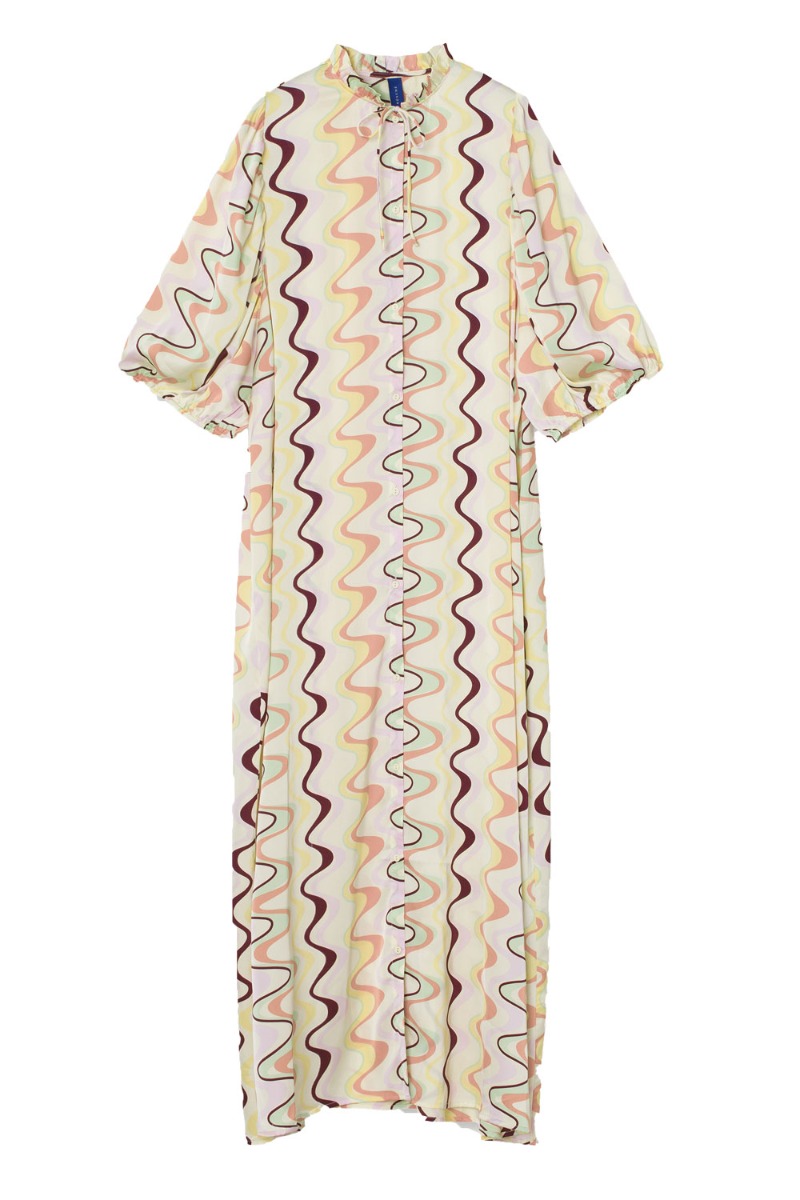 Kjolen er løs i pasformen i en helt let fint og elegant udtryk med knapper hele vejen ned, store løse ærmer og flæsekant i kraven der kan findes foran. Vi kan ikke vente med at hopppe i denne kjole til de varme sommerdage og til diverse fester med en stilet.