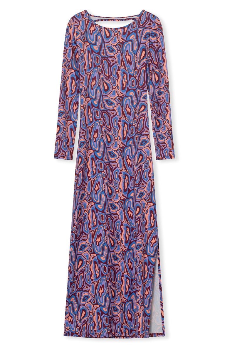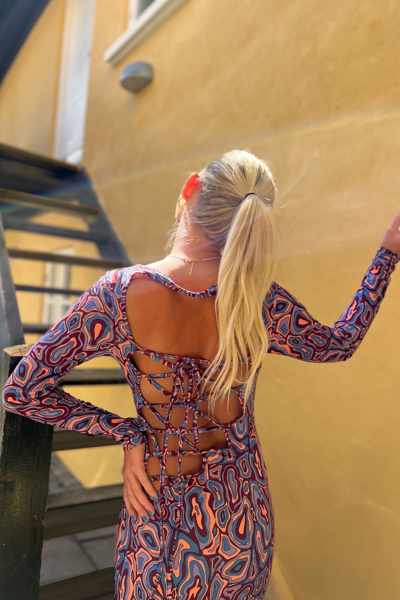 Hold på hat og briller! Nu er den smukkeste kjole fra Résumé landet her på shoppen. Kjolen har denne dybe ryg som går skrå ned til venstre side og holdes sammen med krydssnørring hele vejen op. Kjolen har lange ærmer og er lang i modellen. Derudover er der en slids i venstre side. Printet er også for sig selv og kvaliteten er med stræk så den falder helt tæt til kroppen. Det er bare en rigtig WAUW kjole!