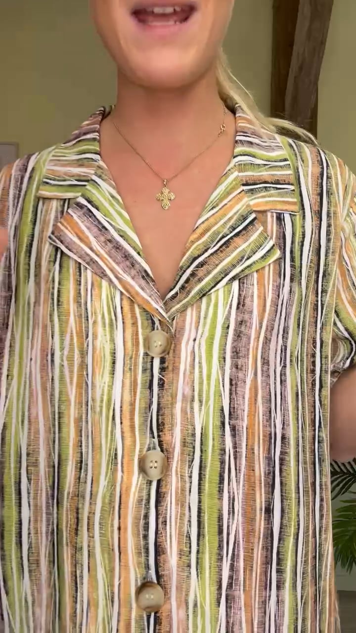 Denne skjorte er i et sejt grafisk stribet print i grønne og orange farver der giver et rigtig forårslook. Den er oversize med ekstra længde hvilket giver et afslappet men samtidig eklussivt udtryk - VI ELSKER DET! Foran knappes den med knapper der skaber en lille v-udskæring. Style med matchende bukser eller til en army nederdel.