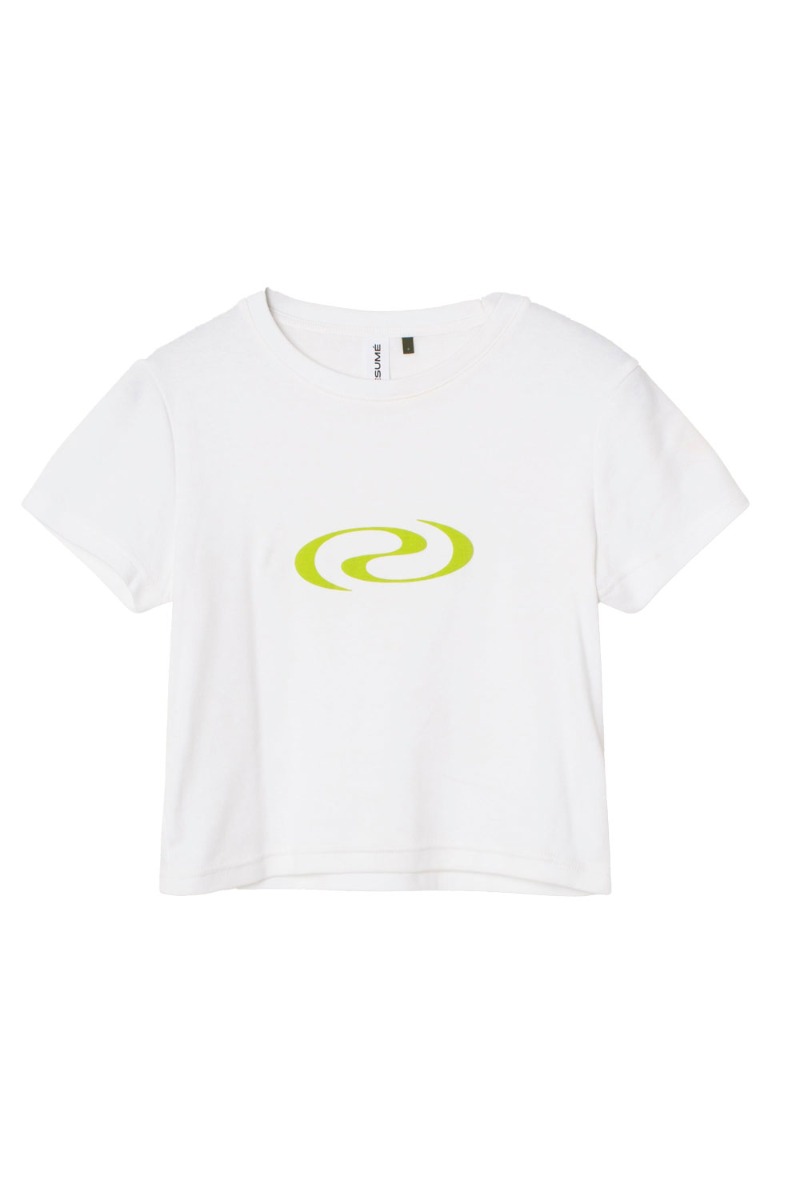 Hvid crop tee med grønt Résumé logo foran. T-shirten er lettere tætsiddende med korte ærmer og super cool til højtaljet jeans eller nederdel.
