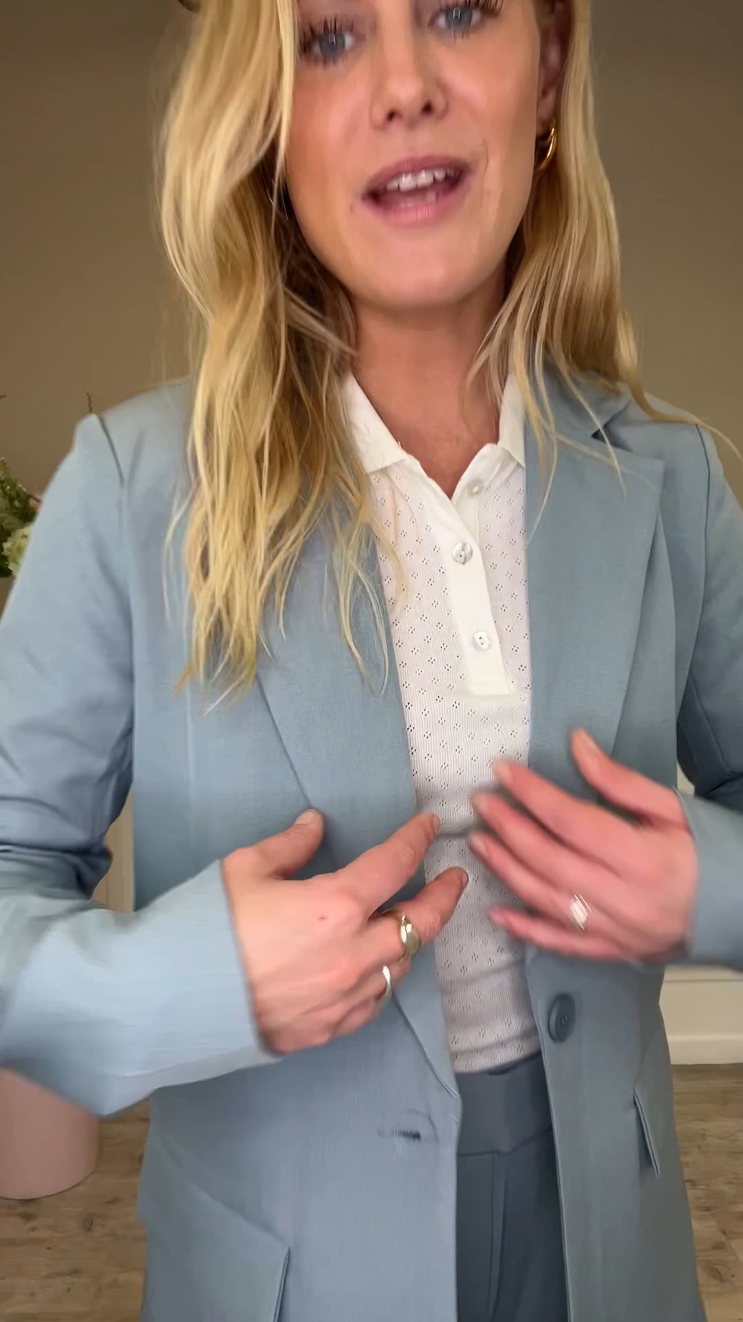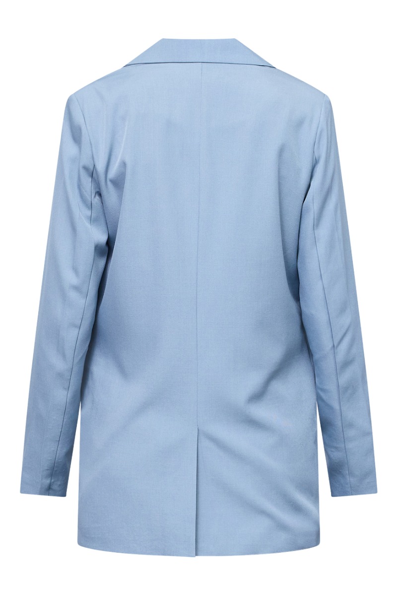 Blazeren er udført i en lys, støvet blå farve og har et klassisk, elegant snit. Den har en lige, let afslappet pasform med lange ærmer og en markant reverskrave, som giver et tidløst udtryk. Foran lukkes den med én enkelt knap, og de dekorative klaplommer tilfører et skræddersyet look. Materialet falder pænt og glat, hvilket gør blazeren velegnet både til kontorbrug og mere afslappede, stilrene outfits.