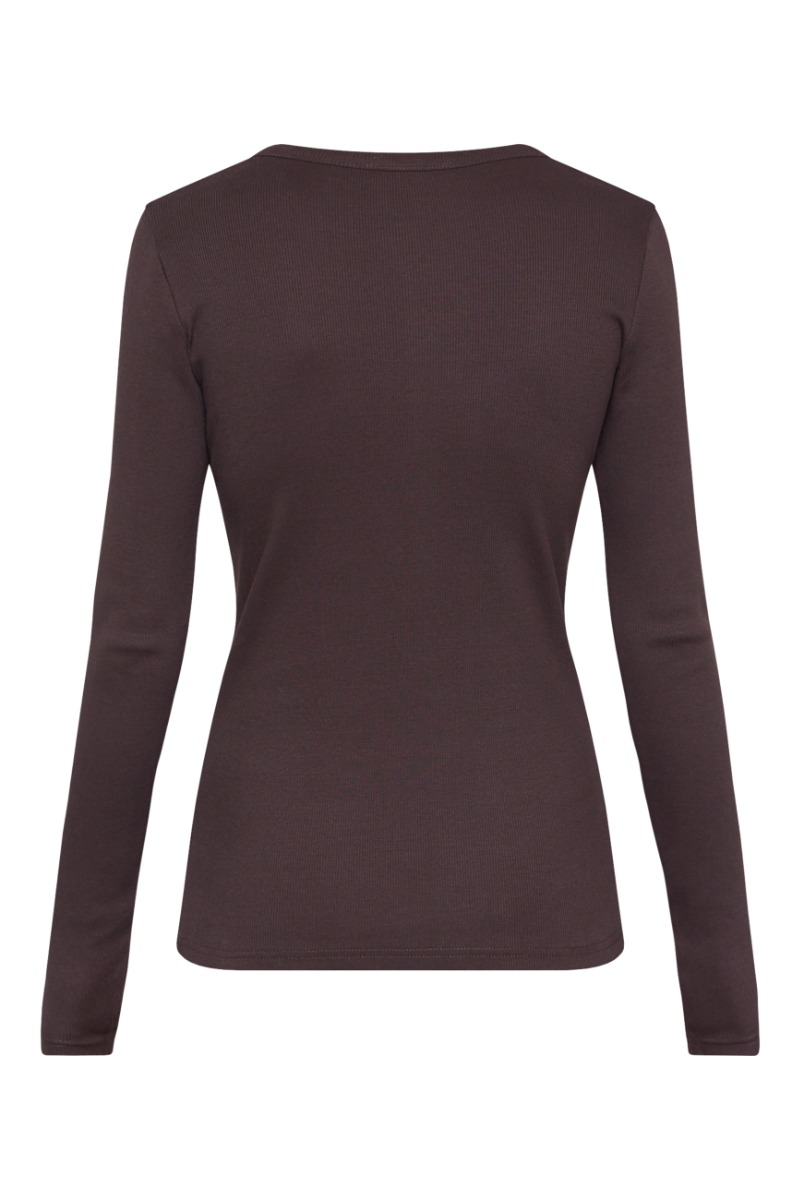 En helt klassisk langærmet bluse her fra Sisters Point. Denne bluse er i en smuk chokolade brun farve, som man altså altid kan bruge, og den er i et ribbet materiale, som bare er super behageligt at have på!