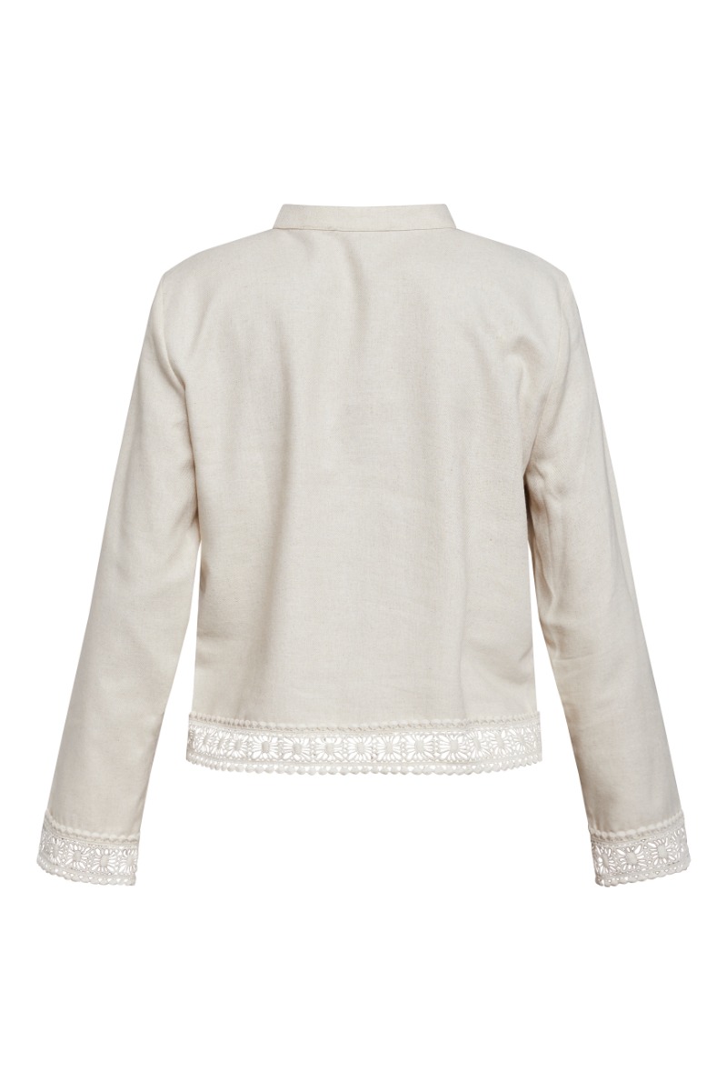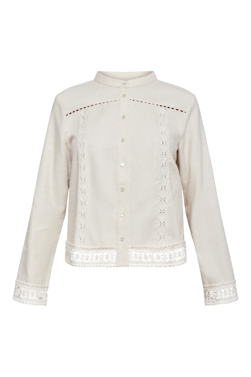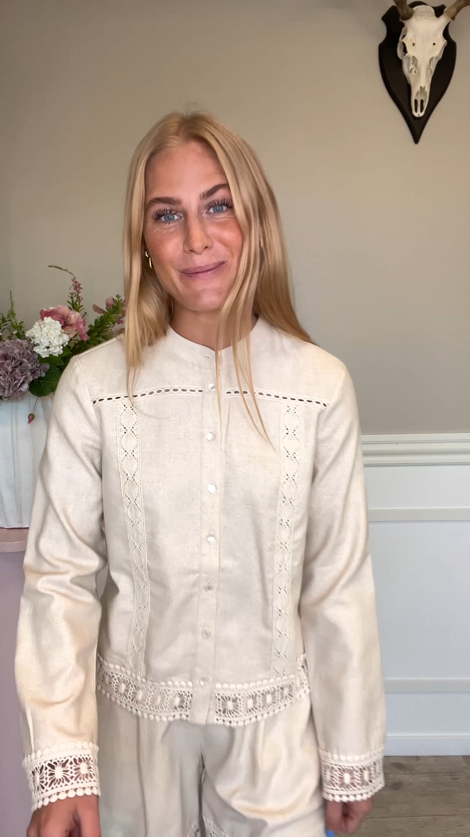 En fin skjorte fra Sisters Point er lige landet. Den er i en smuk beige farve i hørlook med fine hæbklet detaljer. Derudover er den med kinakrave og der findes et par matchende shorts.