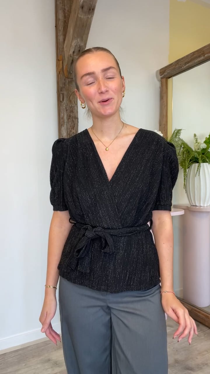 En virkelig fin bluse fra Sisters Point med korte ærmer, V-udskæring og bindebånd i livet. Blusen er med glimmertråd, hvilket gør den lidt mere festlig, så du altså sagtens kan have den på til festlige lejligheder.