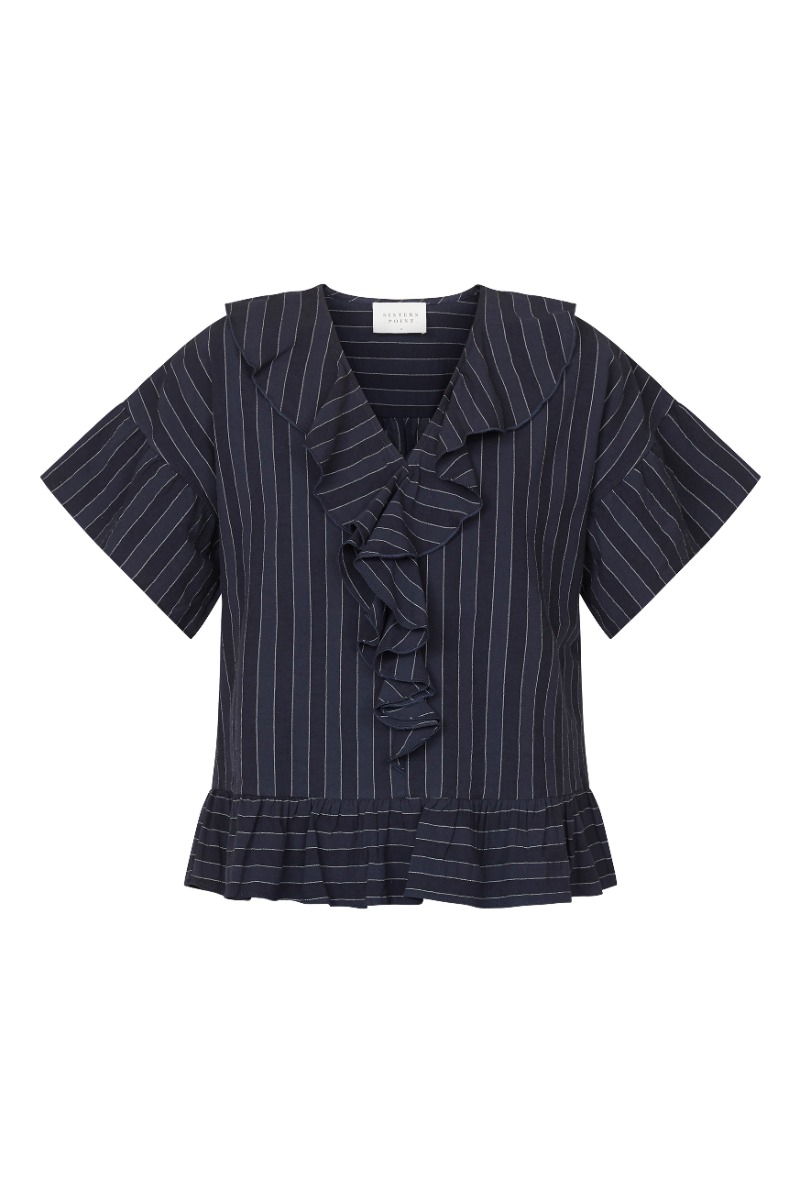 En fin bluse fra Sisters Point er kommet i navy med tynde hvid nålestriber. Den er løs i pasformen og med flæse detaljer ved bund, ærmer og bryst. Den har V halsudskæring og er i en dejlig let kvalitet.