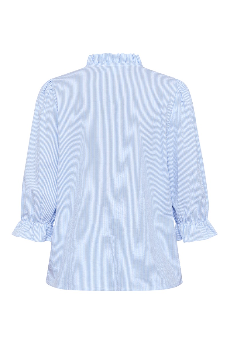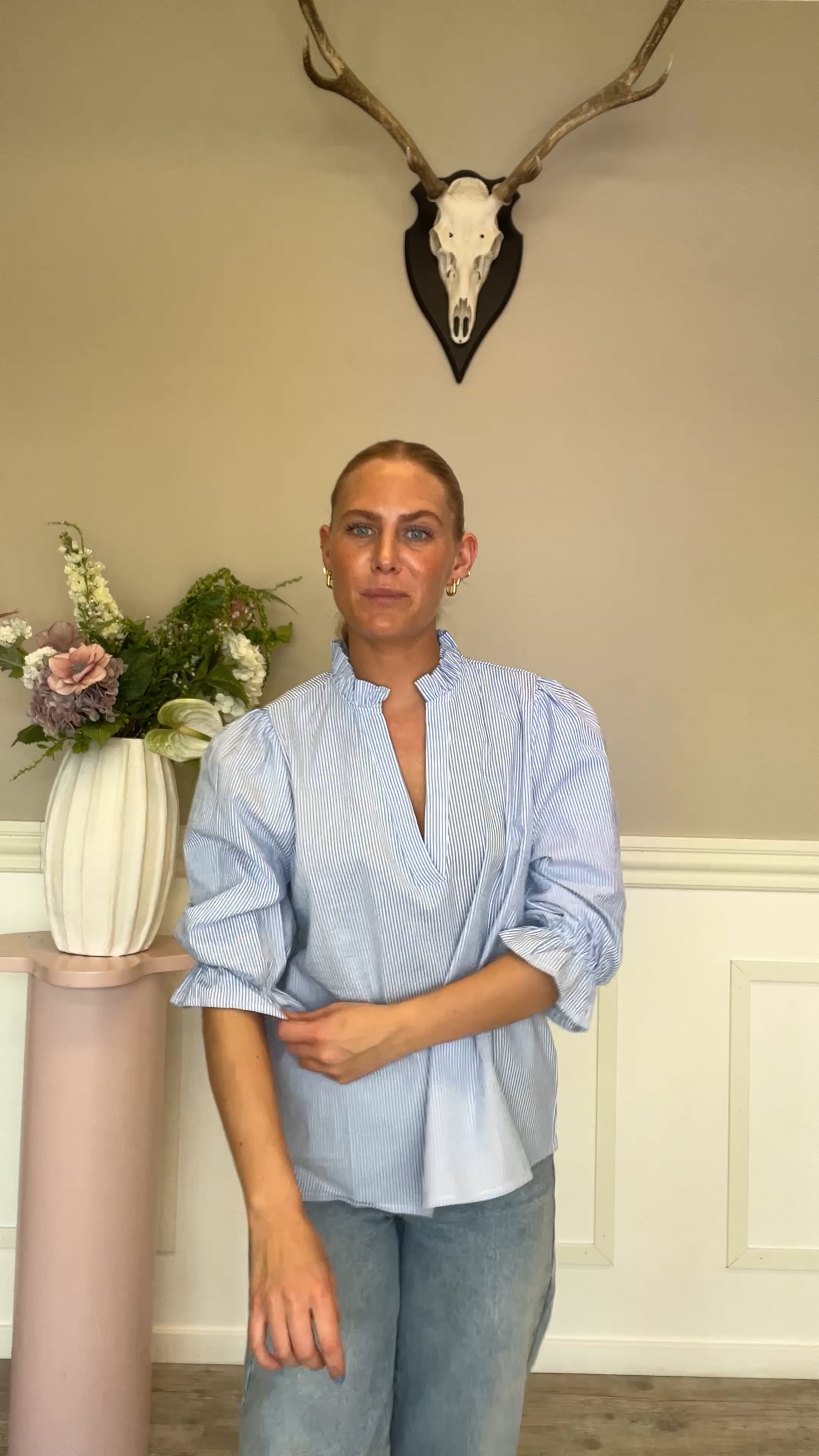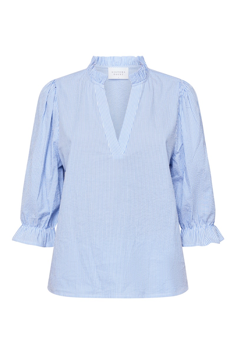 Bluse fra Sisters Point. Denne bluse har et enkelt design, som er super nem at style både til hverdagsbrug eller særlige anledninger. Den har et blåt/hvidt stribet mønster, v-hals og søde flæsedetaljer ved ærmer og krave.