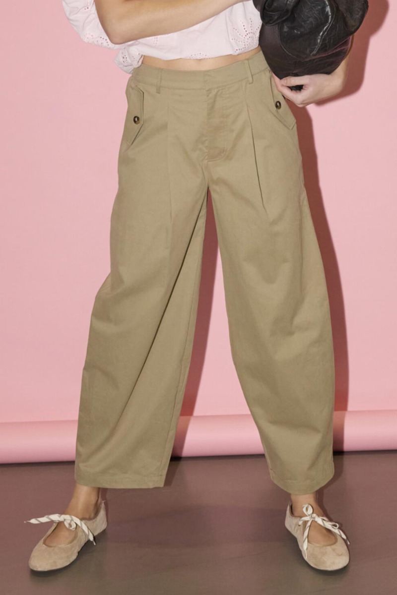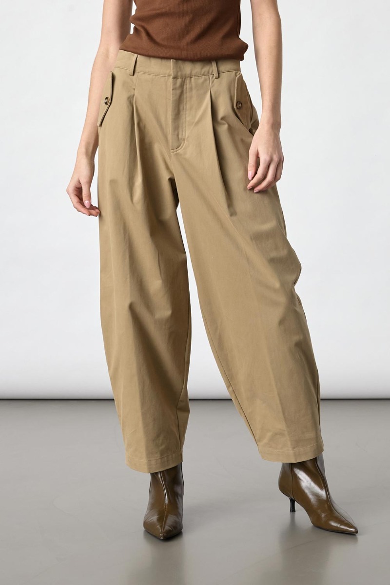 Stilfulde og moderne bukser i en klassisk sandfarvet nuance, der giver et tidløst og alsidigt udtryk. Modellen har høj talje med bæltestropper, diskret lynlåslukning samt læg foran, som skaber en flot og afslappet silhuet. De dekorative lommedetaljer med knap i siderne tilfører et elegant og moderne touch.